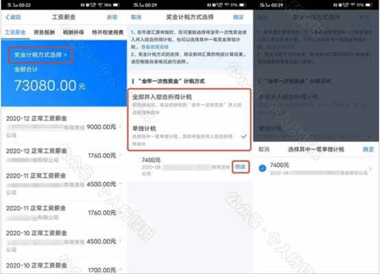 3.全年一次性奖金计税方式选择。年度汇算时,可将全年一次性奖金合并至综合所得计税,也可单独计税,不同的选择,应退(或应补)税额不同,请务必比较,自主选择最优惠的方式。