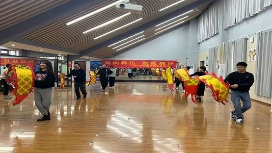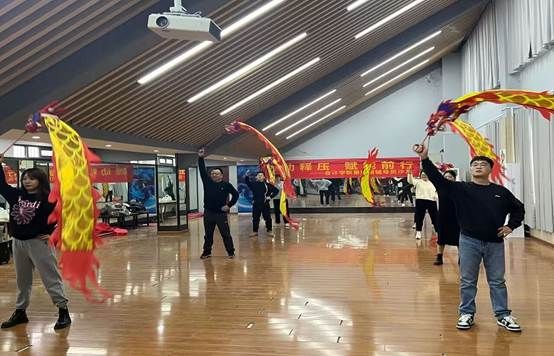 活动伊始,赵艳带领全体参与者进行热身运动,并现场示范彩带龙舞技法。通过手臂摆动、脚步移动、腰部扭动等身体多部位协调配合,彩绸随着龙头的摆动腾空而起,如龙飞天。活动现场欢声笑语不断,氛围热烈融洽,辅导员们在翩翩起舞中释放压力、放松心情、舒缓身心。