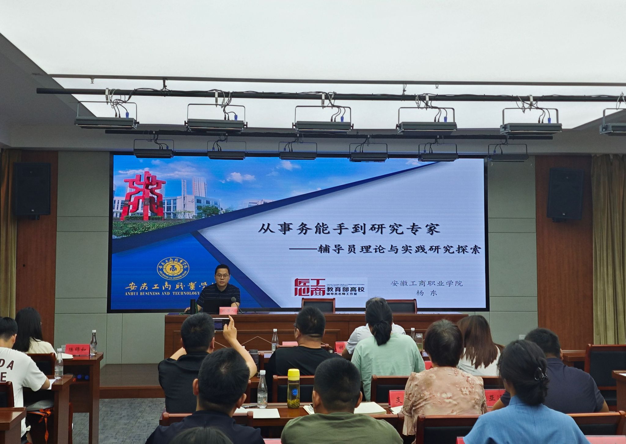 近日,安徽工商职业学院“职驭未来,赋能育人”辅导员职业规划与就业指导能力提升培训在黄山市徽州区委党校举行。“匠心工商”辅导员名师工作室负责人杨东老师受邀作专题讲座,为全校辅导员带来题为“从事务能手到研究专家——辅导员理论与实践研究探索”的报告。