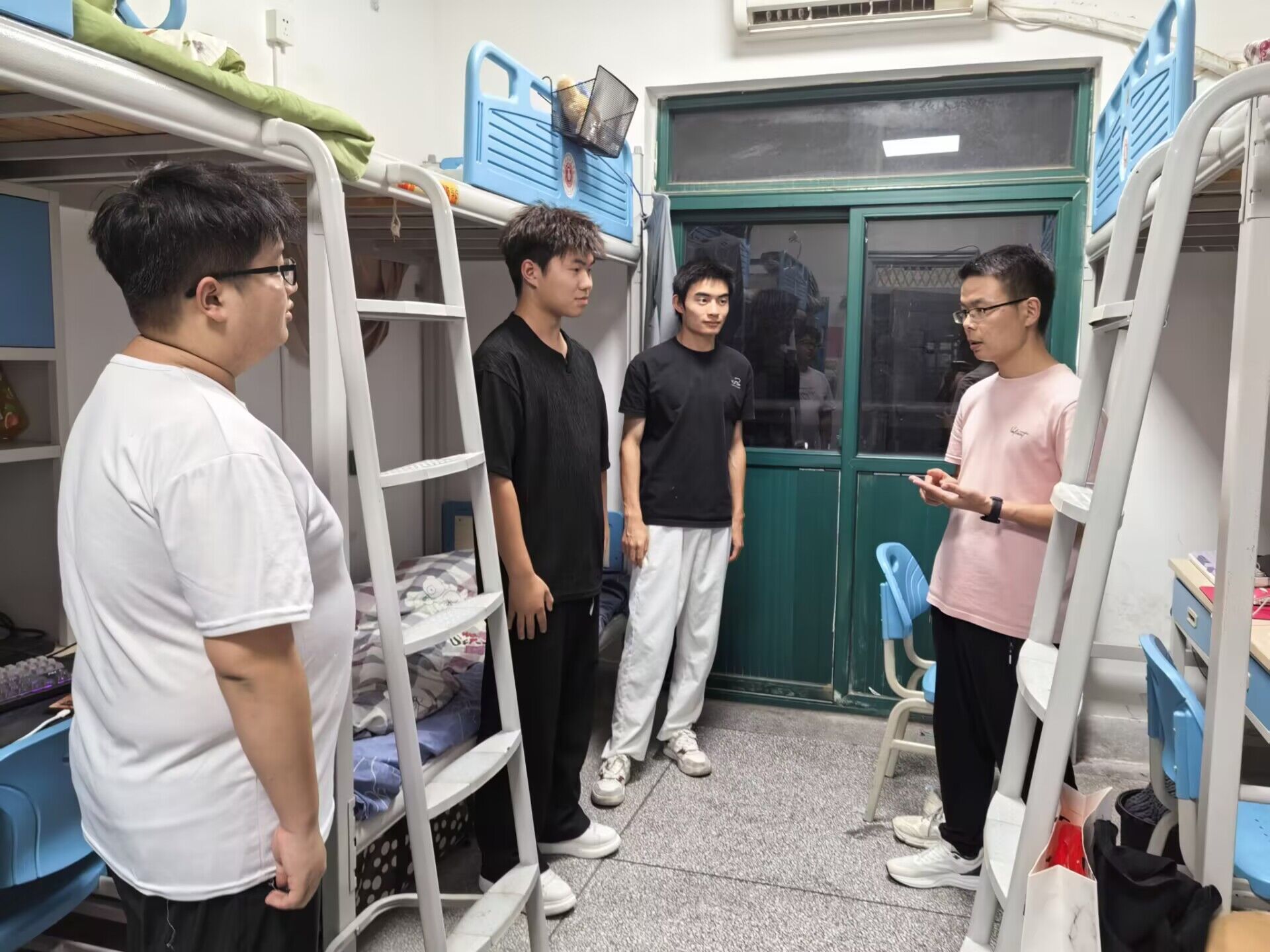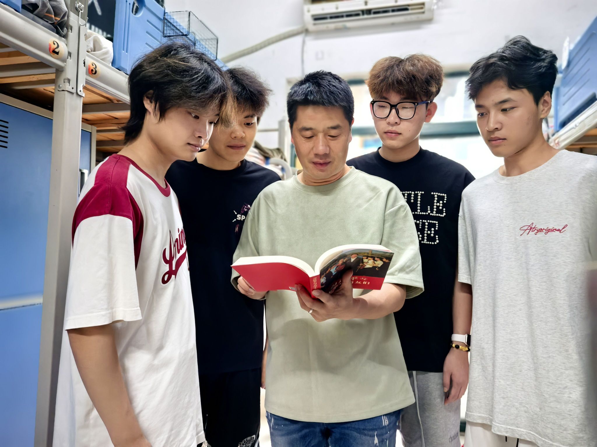 在另一间宿舍,殷宏伟老师手捧书籍,与四位同学开展读书分享会。同学们专注的神情,印证了这种“浸润式”宣讲的吸引力。工作室成员孙群老师组织的“社区茶话会”更是成为了同学们课余时间的热门选择,在轻松氛围中实现了思想引领。