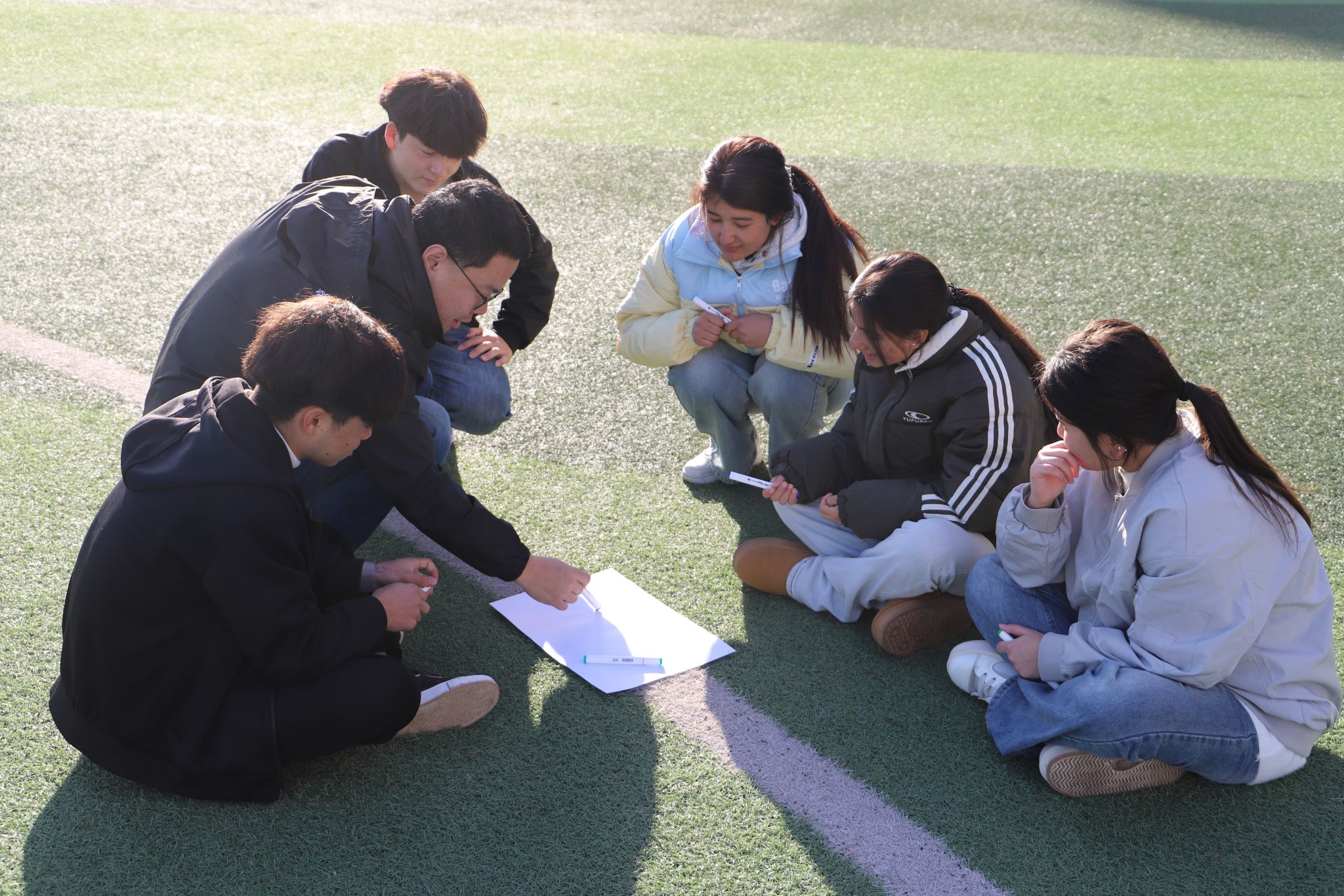 活动设置了“旗帜破冰”“风采展示”“多人多足”等兼具教育内涵与体验深度的拓展环节。在“旗帜破冰”环节,学生们打破初识的隔阂,通过共同设计队旗、构思口号迅速凝聚团队认同。如克耶·阿不力米提同学在讨论中展现出活跃的思维与包容的沟通态度,帮助小组快速形成合力。“风采展示”环节则成为同学们展现自我、表达多元文化的舞台,阿依努尔·艾山同学以一段优美的新疆舞蹈传递出浓郁的民族风情,麦尔旦·阿卜杜拉同学所在小组则通过自编自演的情景剧,生动诠释了“团结就是力量”的深刻内涵。而在“多人多足”协作竞赛中,各组同学步伐一致、口号整齐,在身体力行的配合中深刻体悟协同共赢的意义。