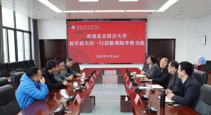 齐建平首先对赵军武一行的来访表示热烈欢迎,并介绍了我校的基本情况。李雪介绍了我校国际化办学与英国、爱尔兰中外合作办学情况,并希望与北京语言大学开展国际教育合作。