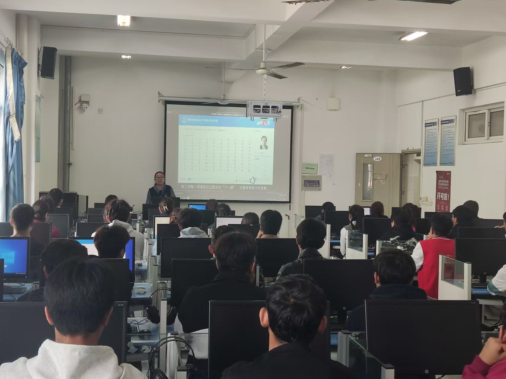 我院在正式测试前对参加测试监考教师和考生都进行了普通话水平测试相关流程、操作等注意事项的培训;考中要求监考教师认真做好考生的信息采集、身份验证、信息确认等工作;考生必须严格遵守普通话水平测试规程及考场纪律,确保测试工作万无一失。(撰稿:韩颖 审核:陈清清)