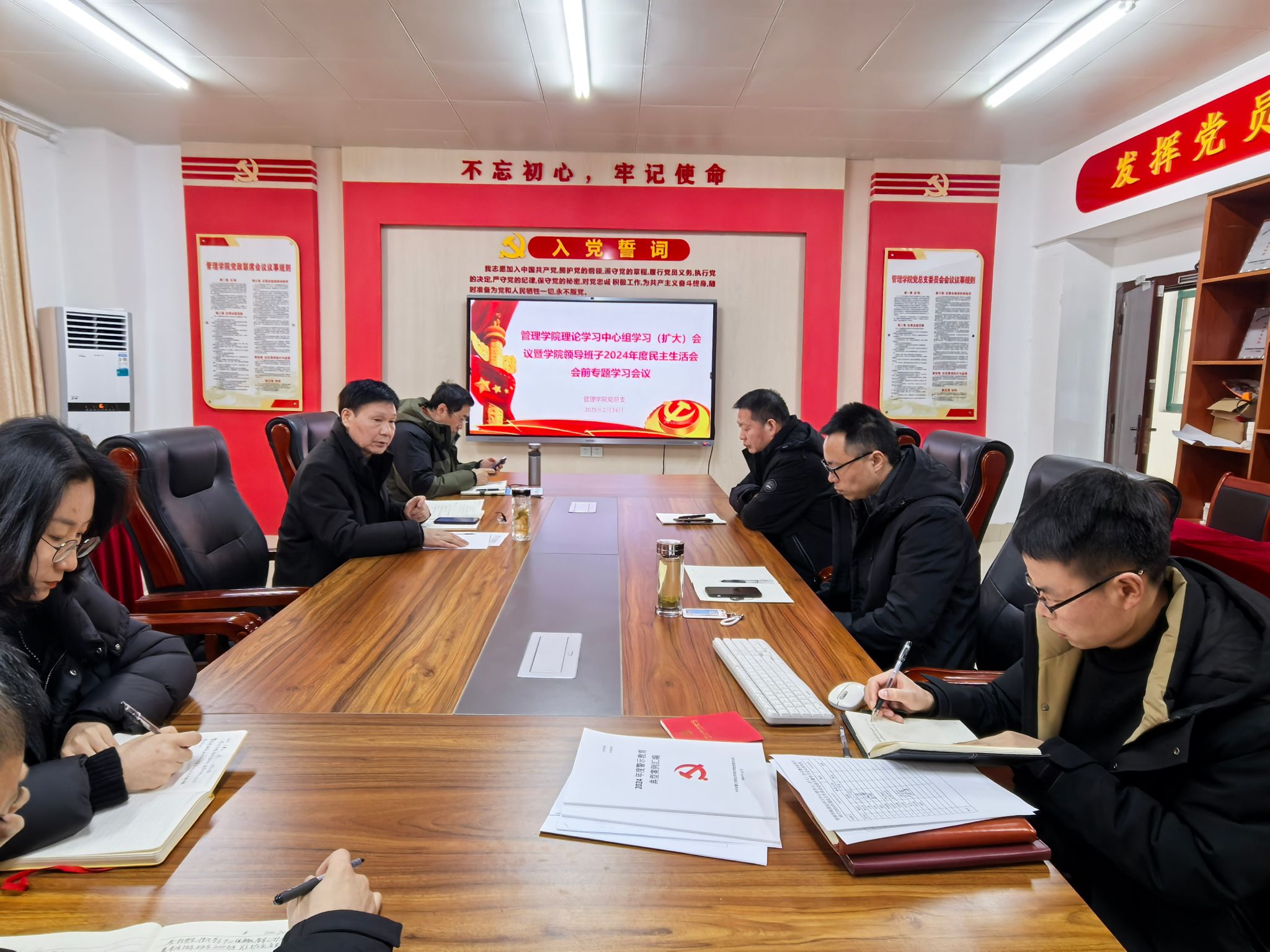 2月24日中午,管理学院党总支于学院党员活动室召开二级理论学习中心组学习(扩大)会议暨学院领导班子2024年度民主生活会会前专题学习会。会议由学院党总支书记曹大友主持,学院党政领导班子成员、党总支委员、党支部书记、教研室主任(副主任)参加学习会。