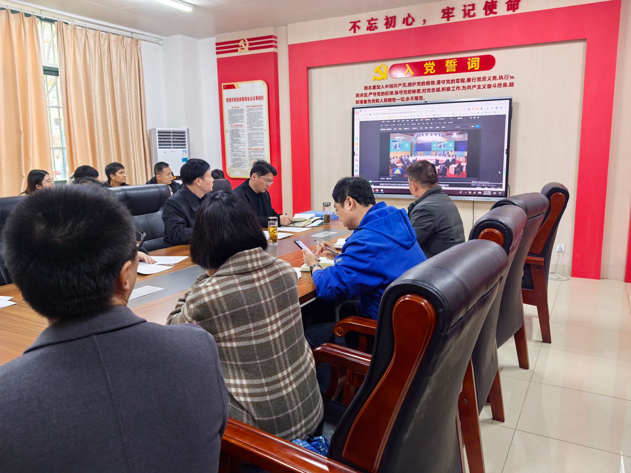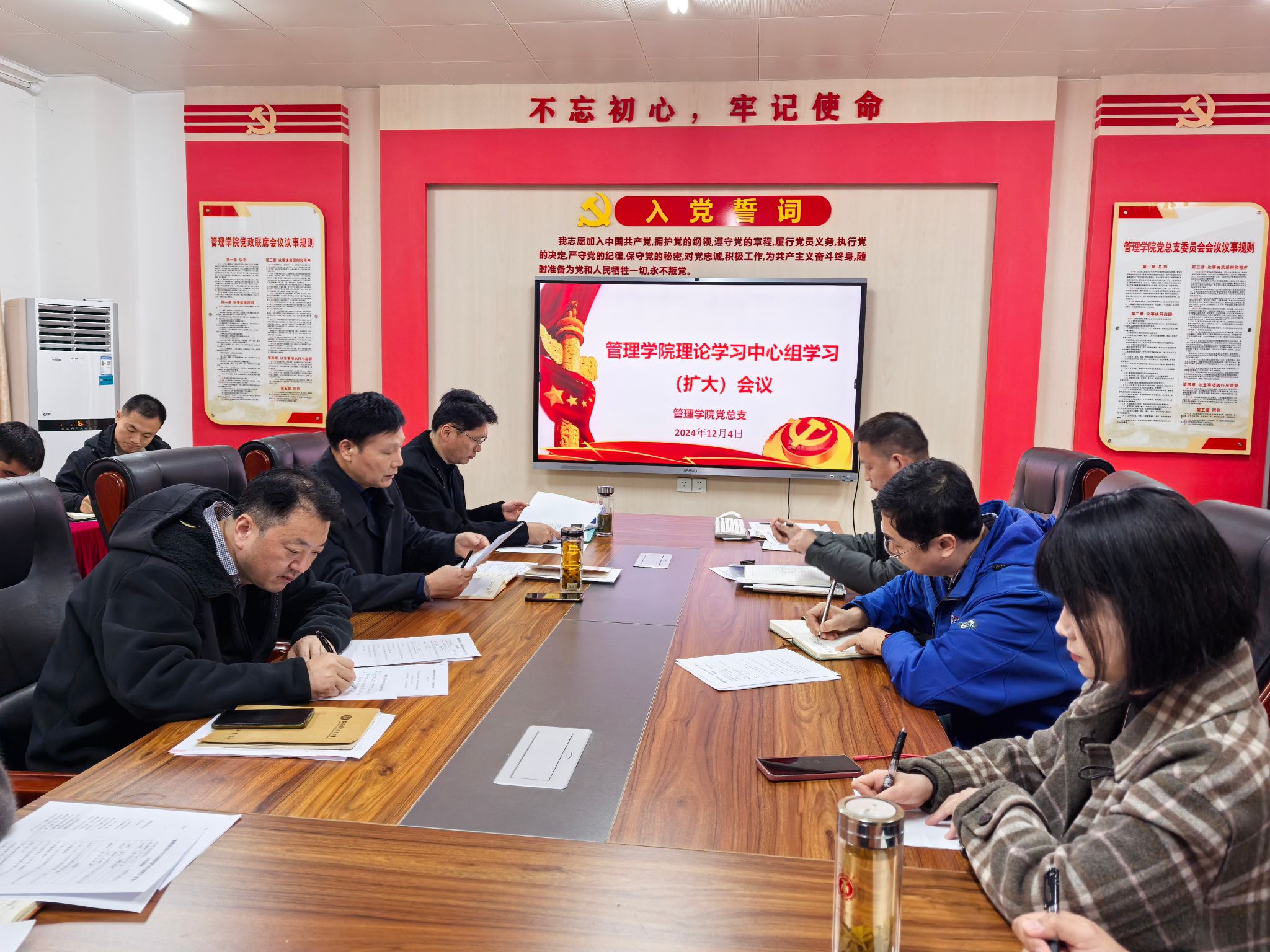 根据校党委关于开展2024年二级党组织理论学习中心组学习列席旁听工作的通知要求,12月4日中午,管理学院召开理论学习中心组学习(扩大)会议。校党委委员、发展规划与质量管理处处长朱小龙列席指导工作,党委宣传统战部副部长马大峰、组织人事处童菲老师列席旁听督导。学院党政领导班子成员、党总支委员、党支部书记、教研室主任(副主任)、行政坐班人员、专任教师及专职辅导员参加学习会,会议由党总支书记曹大友主持。