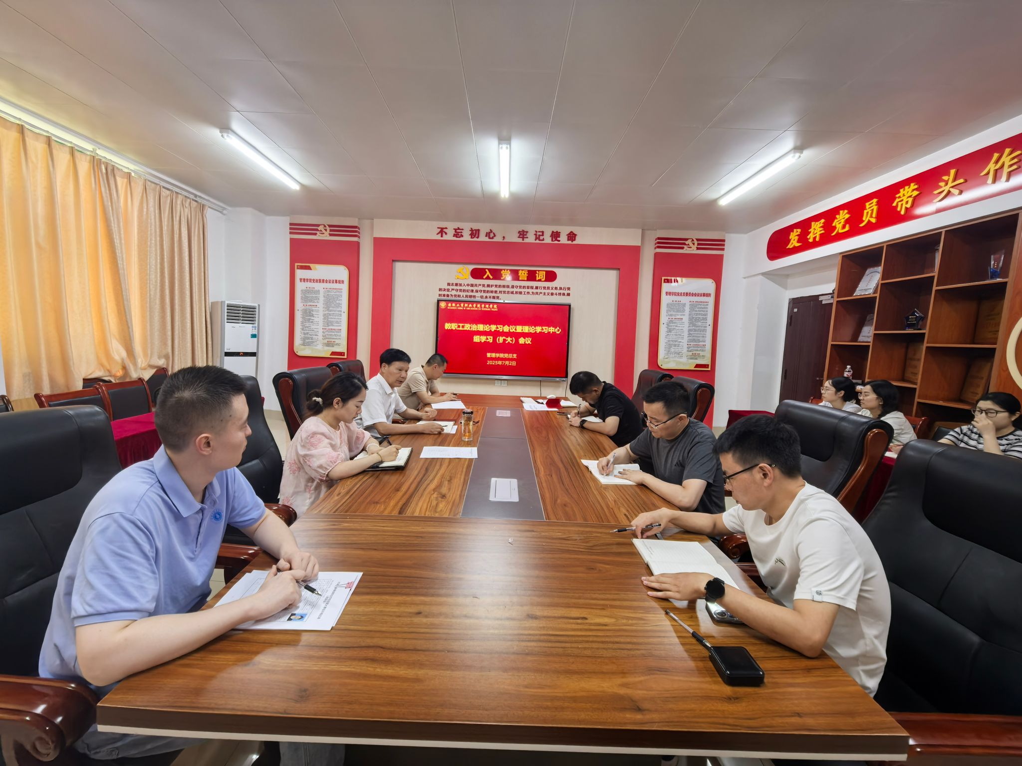 7月2日下午,管理学院党总支组织召开教职工政治理论学习会议暨理论学习中心组学习(扩大)会议,学习贯彻习近平总书记在部分省区市“十五五”时期经济社会发展座谈会上的重要讲话精神、学习《中国共产党章程》《习近平关于加强党的作风建设论述摘编》、传达学习《党委(党组)意识形态工作责任制实施办法》文件精神。学院党总支书记曹大友主持会议,学院党政领导班子成员、党总支委员、党支部书记、行政坐班人员及专职辅导员参会。