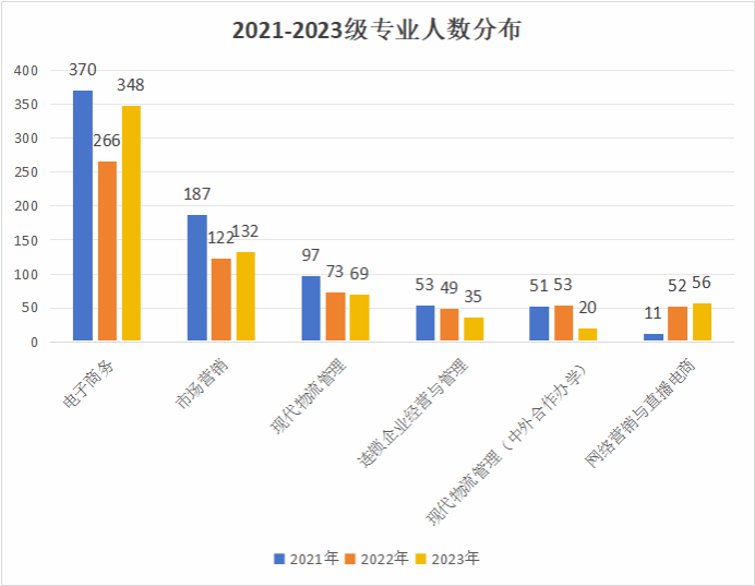 2022-2023学年管理学院共有6个专业,3个年级,64个班,各类在籍学生2145人,其中社招学生合计99人。另有21级安徽财经大学市场营销专业专升本联合培养学生2个班,共100人。22、23级阜阳师范大学工商管理、物流管理专升本联合培养学生5个班、276人。总计2521人。