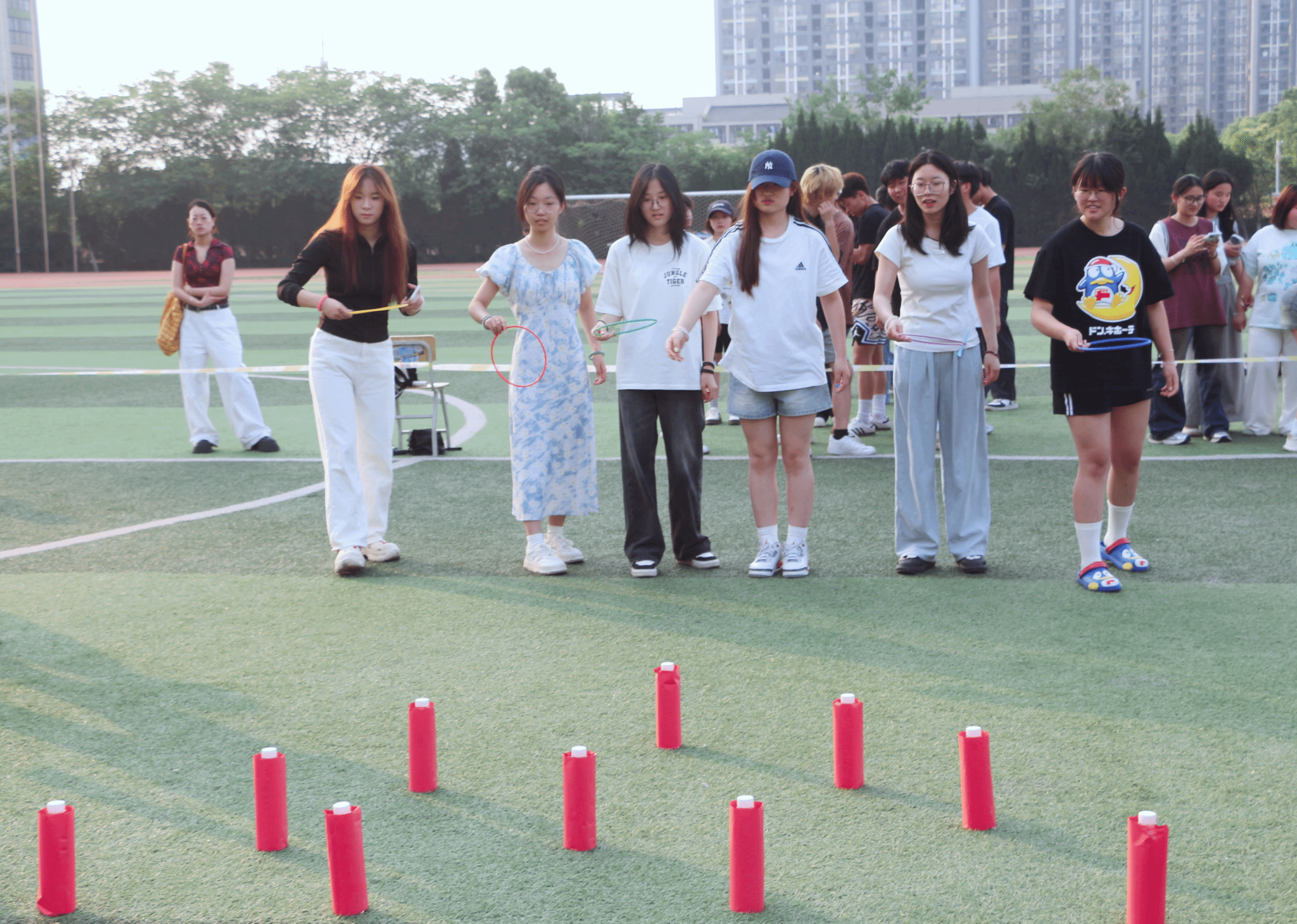 “趣味套圈” 环节则充满欢声笑语。同学们全神贯注施展个人技巧,套圈精准落向目标时,现场掌声与欢呼不断。该项目既考验个人能力,又激发竞争乐趣,同学们为团队争分的同时,彰显青春活力与自信风采。