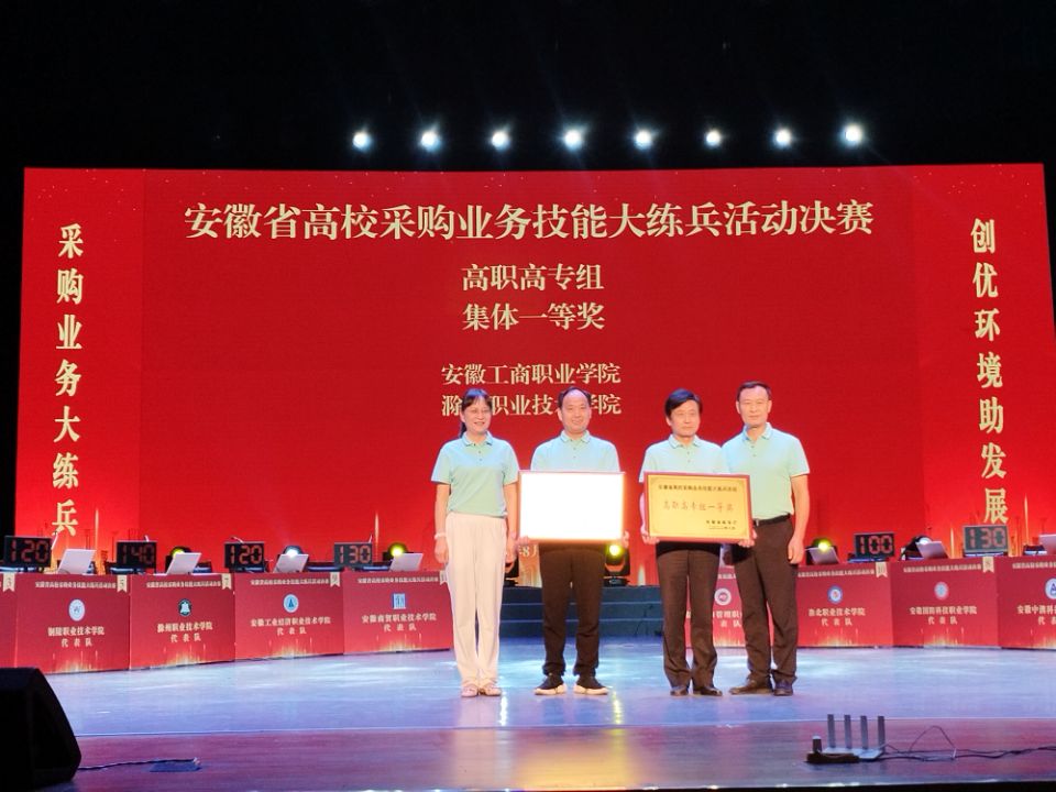 8月27日-28日,安徽省高校采购业务技能大练兵活动决赛在安徽艺术学院举行,我院王国强、未培、杨超三位同志组成的学院代表队参加了高职组比赛,选手们沉着冷静、积极进取,经过初赛、决赛两轮晋级淘汰,最终我院以优异的成绩摘得团体一等奖的好成绩!