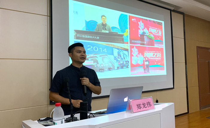 7月26日下午,安徽工商职业学院第五十期意匠讲堂《以梦为马,未来可期---做有情怀的广告设计师》在庐阳校区闻道楼第一学术报告厅开讲。本期讲堂特邀广东机电职业技术学院设计学院专业带头人郑龙伟主讲。艺术设计学院2019级广告艺术设计和产品艺术设计两个专业的同学和部分教师聆听了本次讲座。