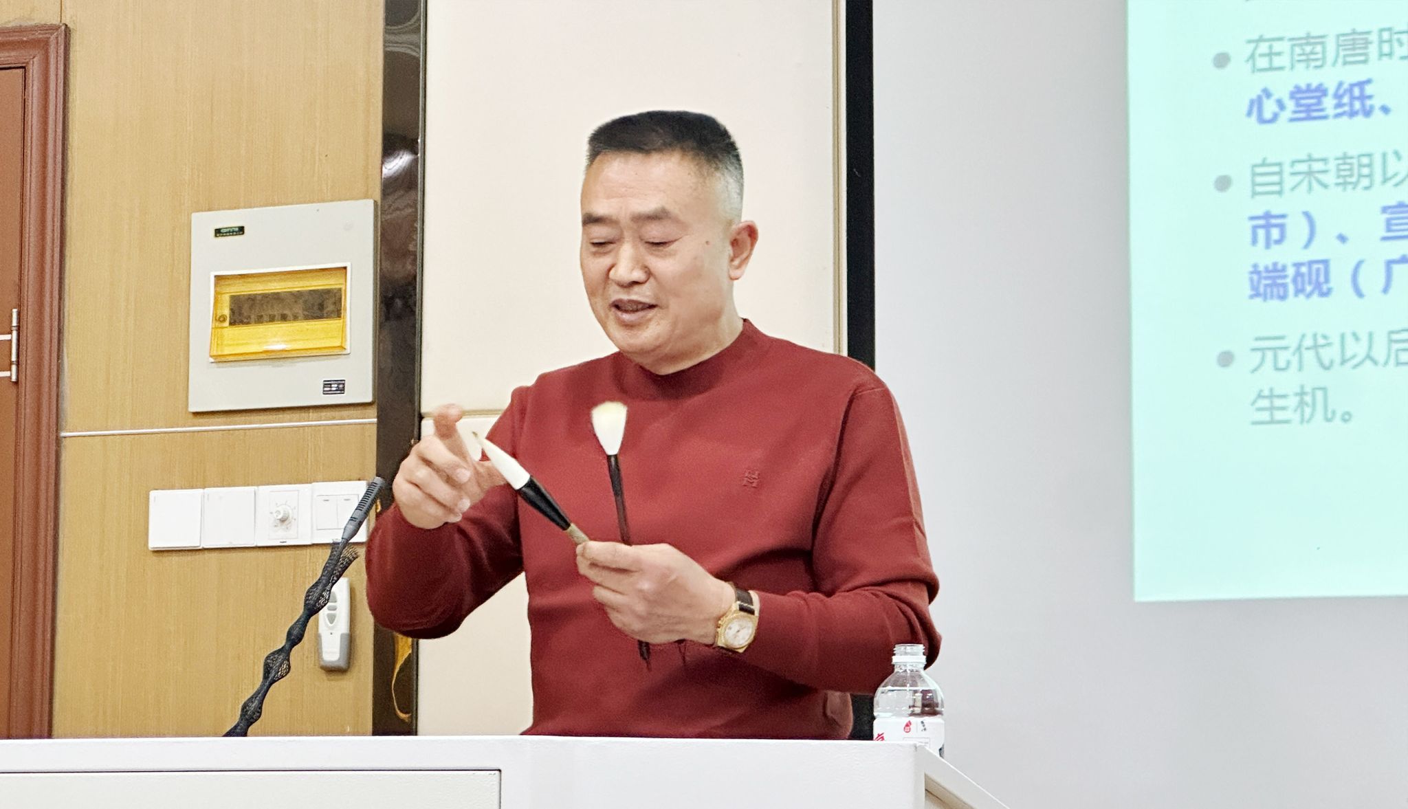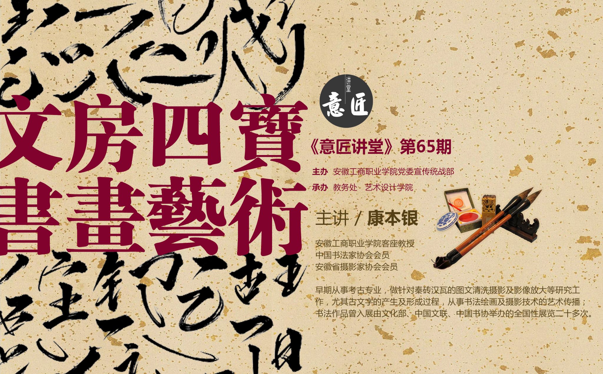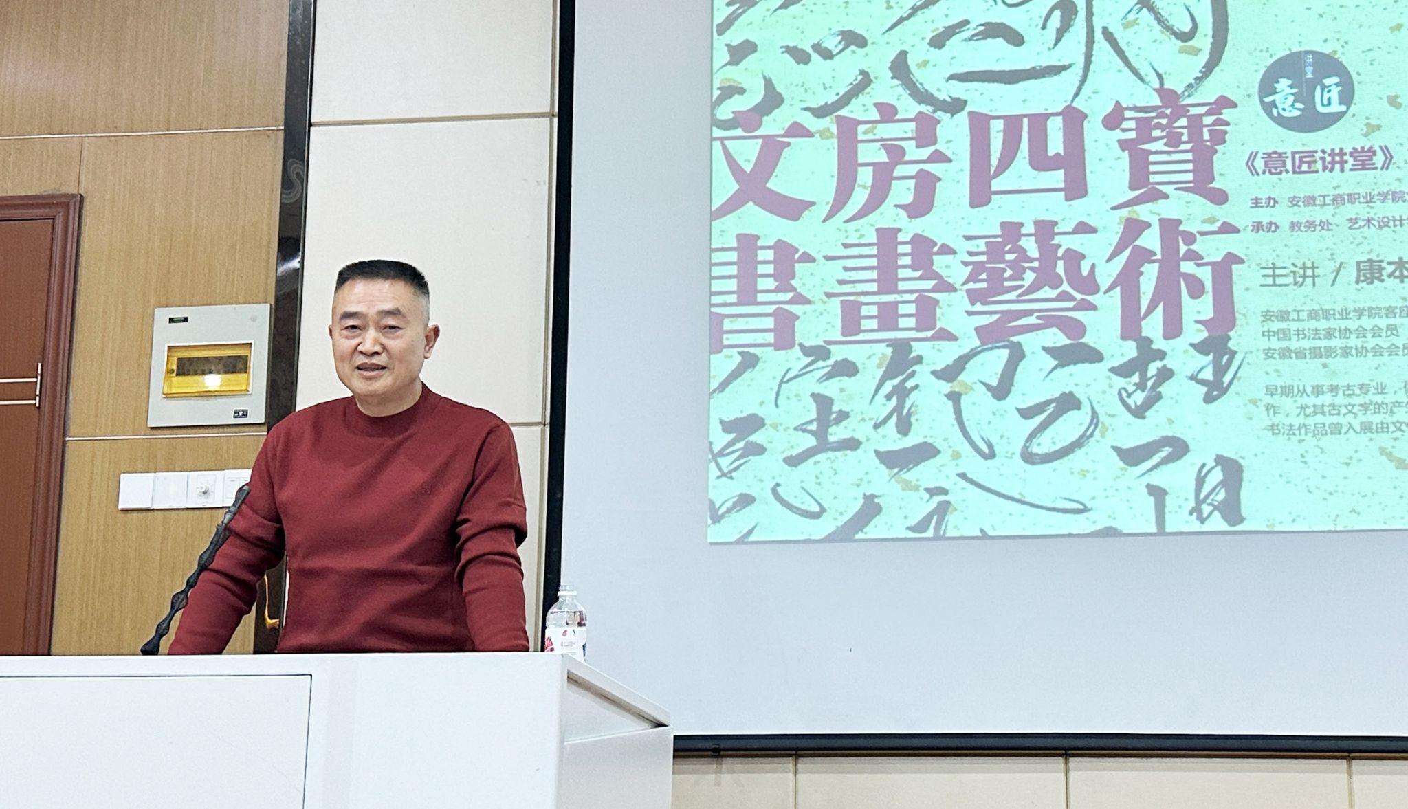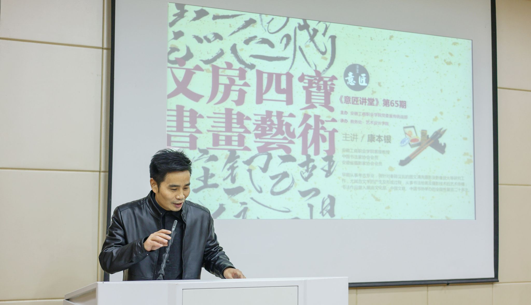 12月18日晚,安徽工商职业学院【第六十五期意匠讲堂】《文房四宝与书画艺术》在庐阳校区开讲。本期讲堂特邀安徽工商职业学院艺术设计学院客座教授、中国书法家协会会员康本银担任主讲。