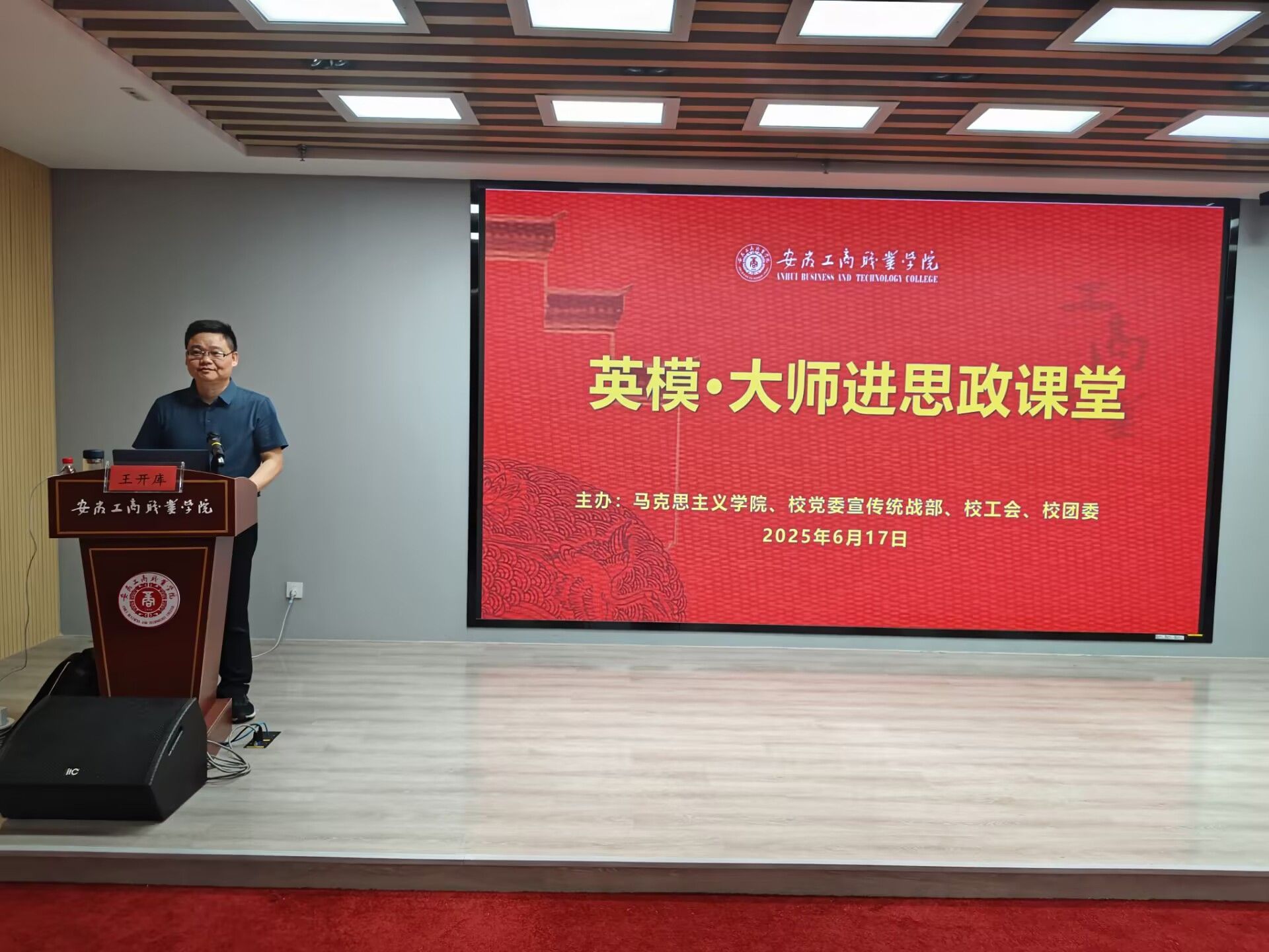 2025年6月17日,安徽工商职业学院“英模·大师进思政课堂”主题报告会在红色报告厅举行。报告会邀请全国劳动模范、中国好人王开库正高级工程师作《传承“四特”传统 践行三个精神》的主题报告。校工会主席朱炜、马克思主义学院党总支书记、院长葛成飞及100多名师生共同出席活动。报告会由马克思主义学院副院长蒋强军主持。
