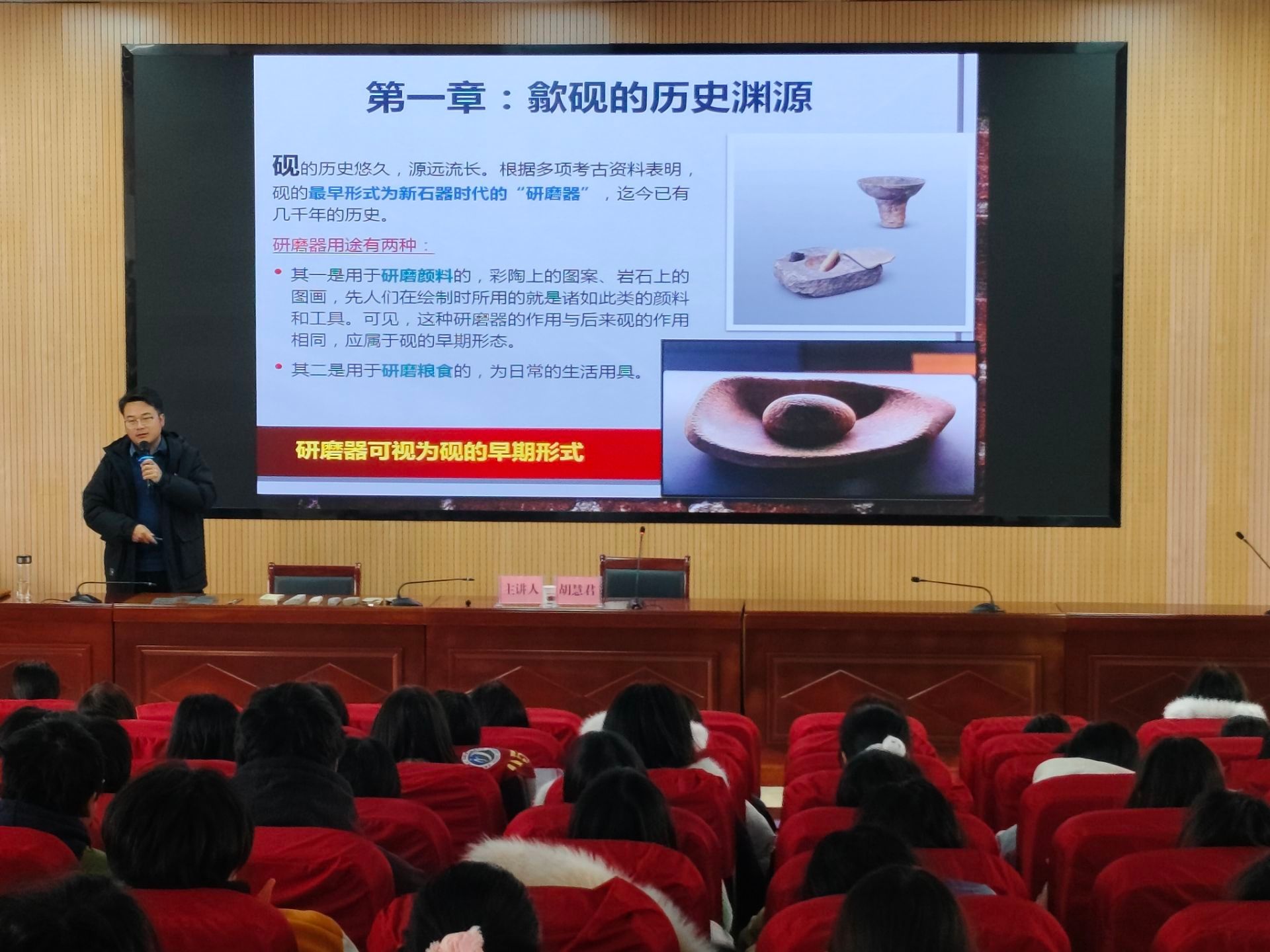 胡慧君以《丹青“砚”道》为主题,从歙砚的历史渊源讲起,引领听众穿越千年,领略砚台背后深厚的文化积淀。他结合自身多年创作与传承经验,系统讲解了歙砚在不同历史时期的形制特点及其与时代审美、社会需求之间的关联。在歙砚作品赏析环节,胡慧君展示了多件个人代表作,其中荣获中国工艺美术百花奖金奖的《秋水共长天一色》等精品,引得现场师生连连赞叹。他娓娓道来每件作品背后的设计理念、雕刻工艺与文化寓意,生动诠释了“制砚不仅是手艺,更是心传”的匠心精神。