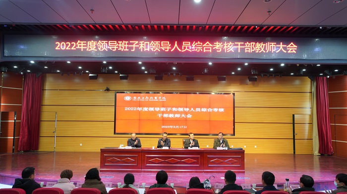 齐建平代表学校领导班子作2022年度工作总结报告。他汇报了2021年度综合考核反馈问题整改落实情况,并从突出党建领航、聚焦立德树人、注重内涵建设、强化服务保障四个方面重点报告了2022年领导班子履职情况。他表示,2023年学校将坚持以习近平新时代中国特色社会主义思想为指导,全面学习贯彻党的二十大精神,忠诚尽责,奋勇争先,在创建更高水平更高层次职业院校的征程上谱写新篇。