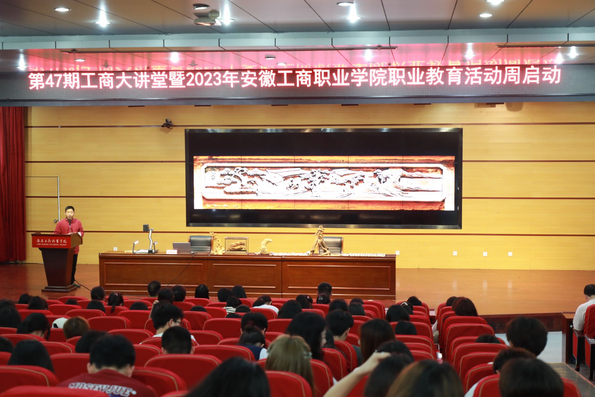 5月17日下午,第47期工商大讲堂暨2023年校职业教育活动周启动式在学术报告厅举行。国家级非遗项目徽州木雕省级代表性传承人、安徽省工艺美术大师汪德洪给大家带来了题为《徽州木雕表现技巧与题材的文化意蕴》的讲座,吸引了200余名师生前来聆听。本次讲座由校党委委员、宣传统战部部长孔成主持。