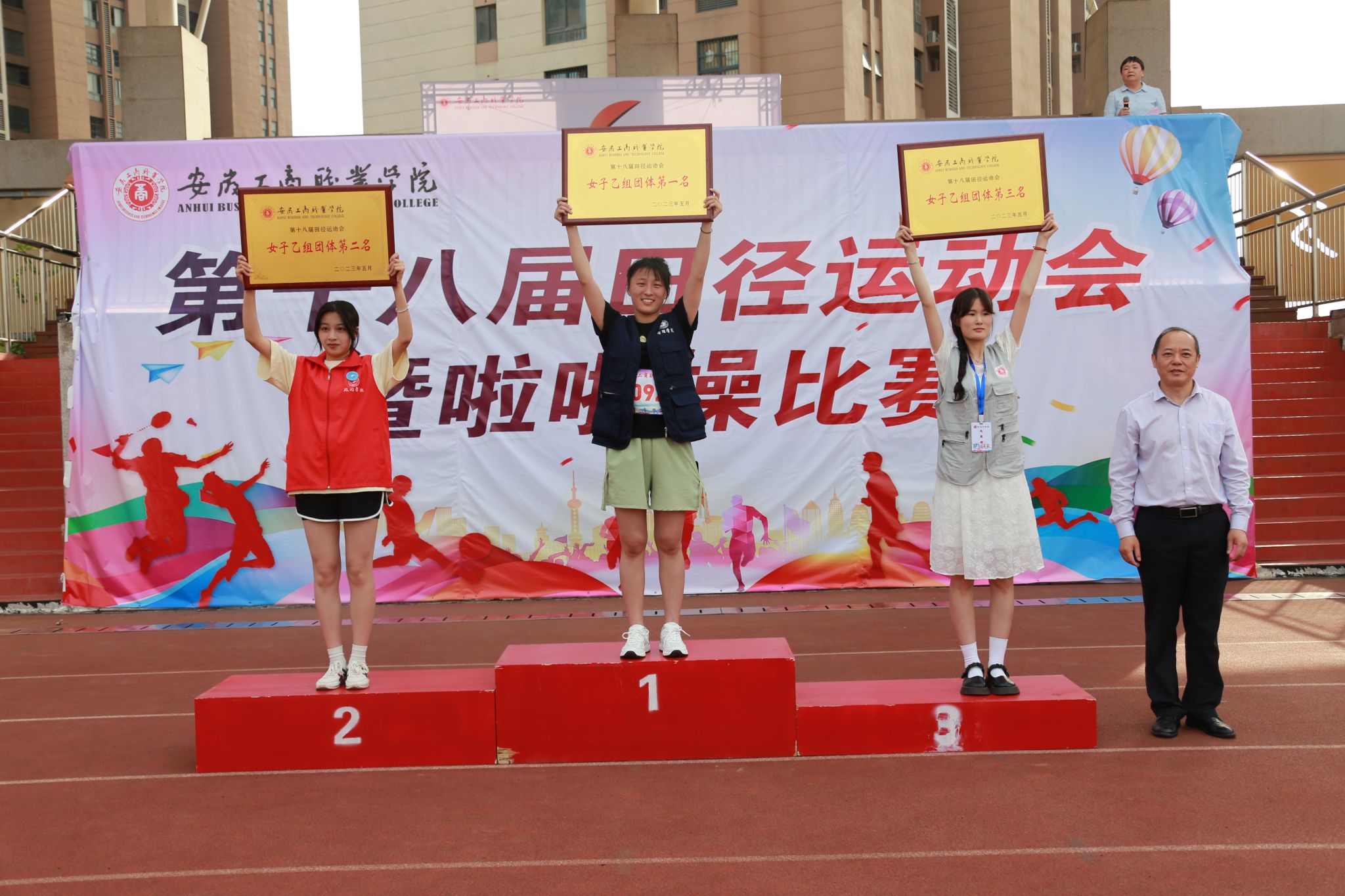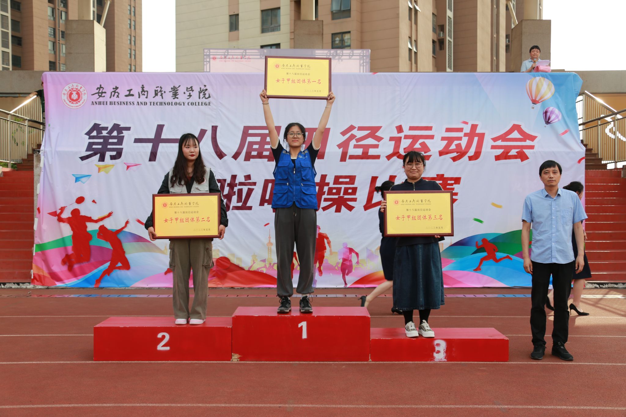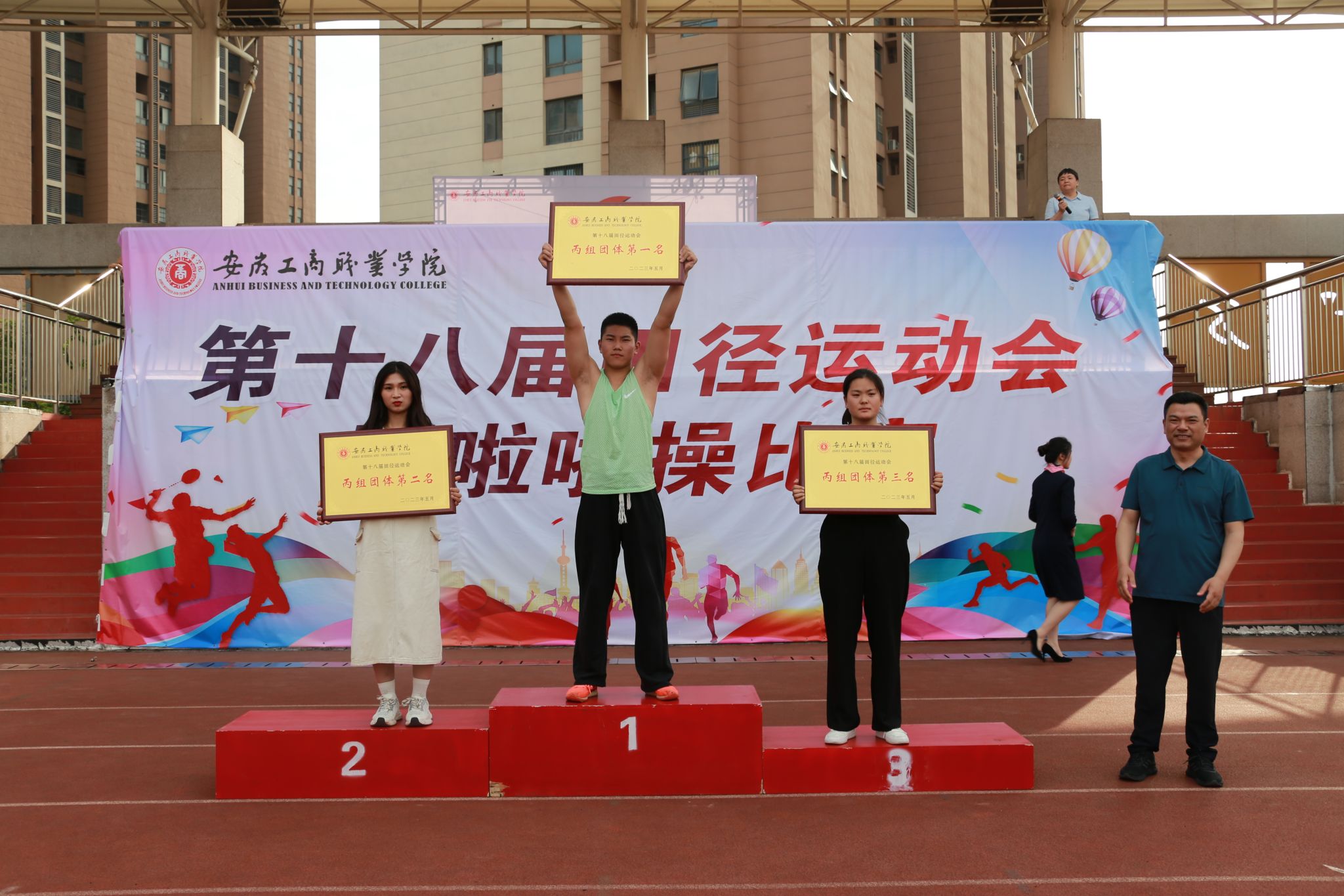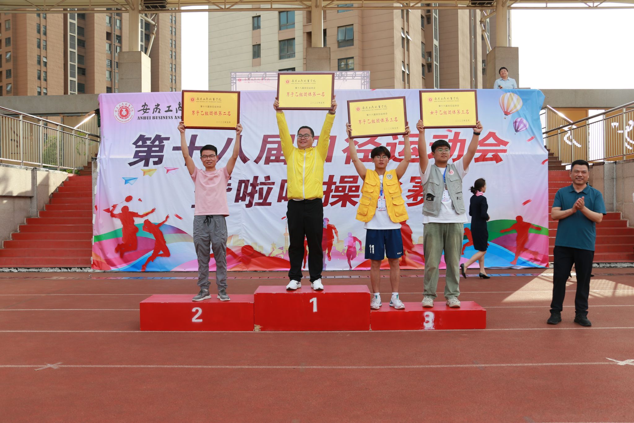 本届田径运动会获得甲组男子团体总分前三名的分别为会计学院、智能制造与汽车学院、经济贸易学院;获得甲组女子团体总分前三名的分别为经济贸易学院、会计学院、智能制造与汽车学院;获得乙组男子团体总分前三名的分别为智能制造与汽车学院、管理学院、信息工程学院和会计学院;获得乙组女子团体总分前三名的分别为管理学院、旅游学院、会计学院;获得丙组团体总分前三名的分别为22健身1班、22健身2班、21健身3班。获得本届啦啦操比赛团体总分第一名的单位为经济贸易学院,团体总分第二名的单位为会计学院、信息工程学院,团体总分第三名的单位分别为管理学院、智能制造与汽车学院、旅游健康学院。获得本届运动会优秀组织奖的单位为智能制造与汽车学院、经济贸易学院、艺术设计学院。