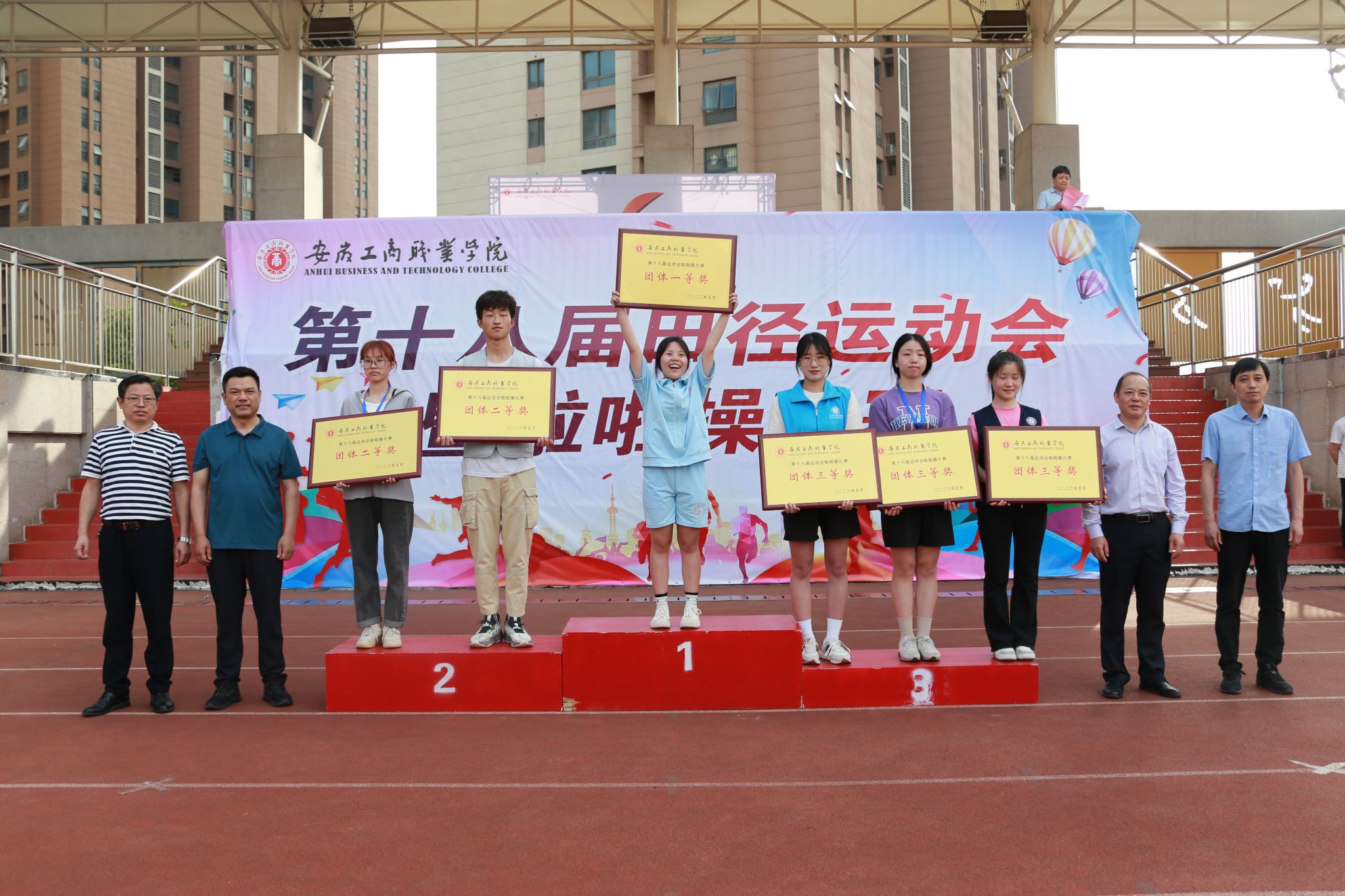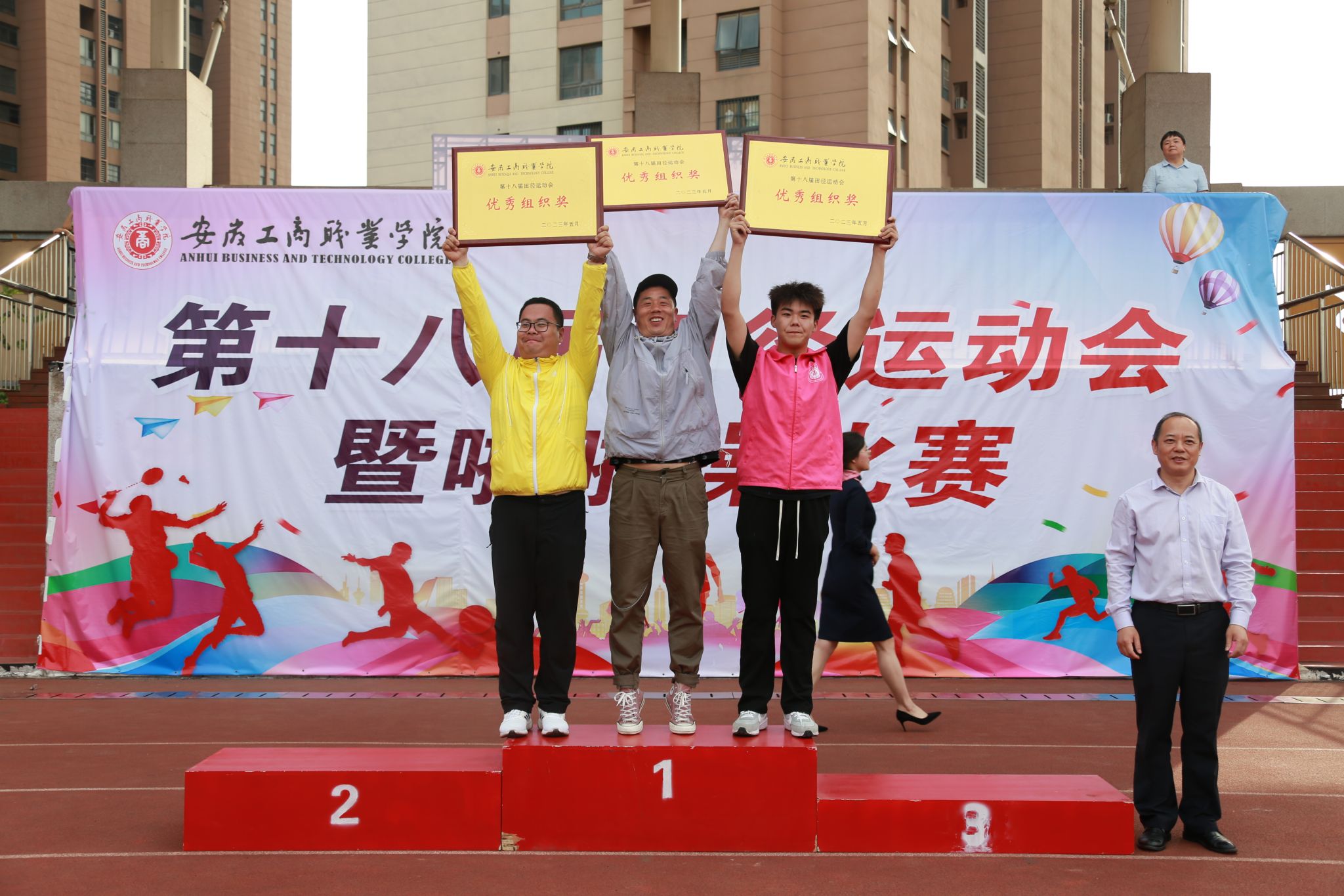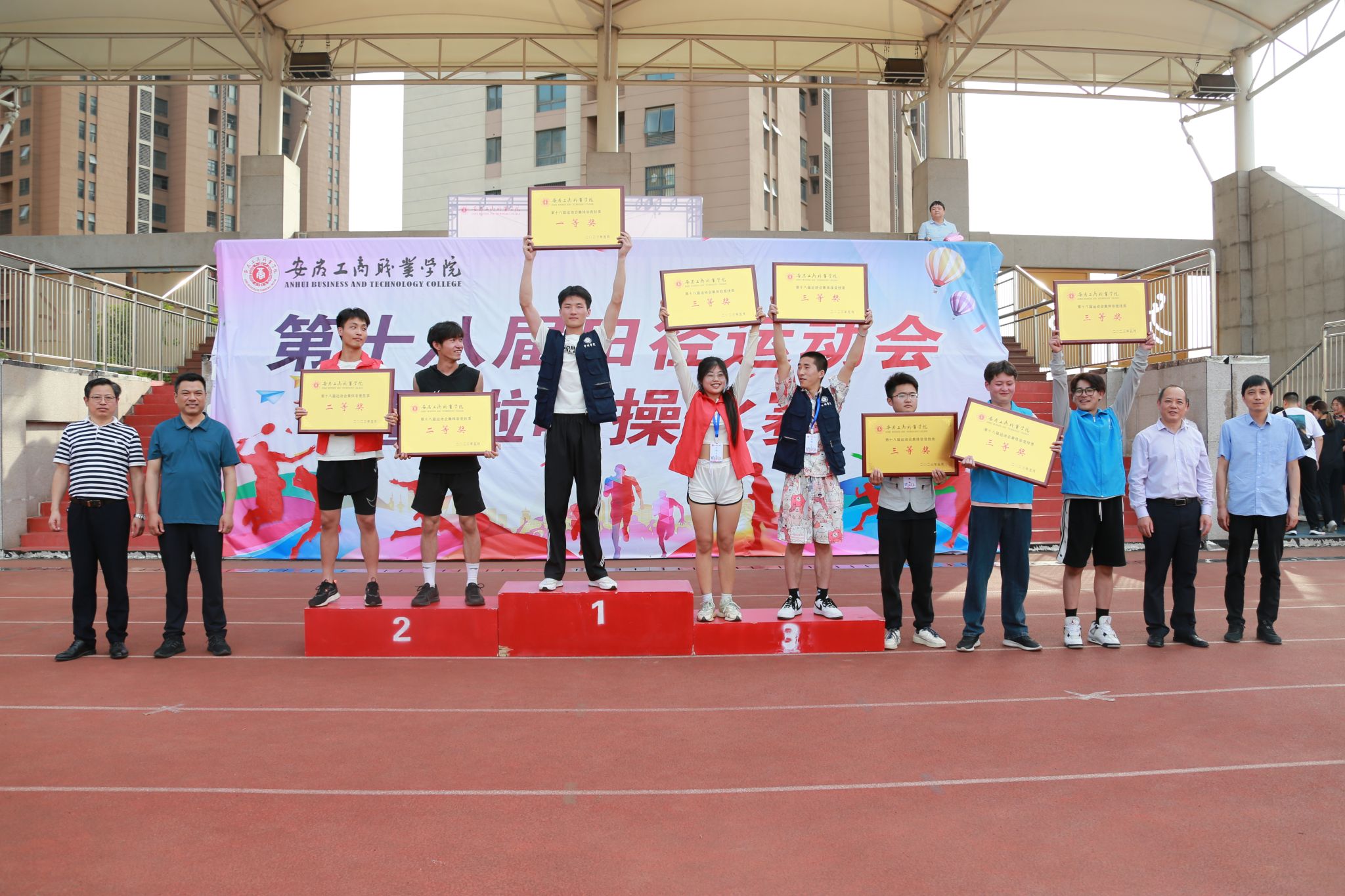 师生拼搏迎盛会,竞技场上竞风流。5月19日下午,阳光明媚、清风和煦,历时三天的全校第十八届田径运动会暨啦啦操比赛顺利完成全部预定赛项,圆满落幕。校领导齐建平、陈行、胡捍东和吴松飞出席闭幕式,并分别为获得各团体奖项的代表队颁奖。