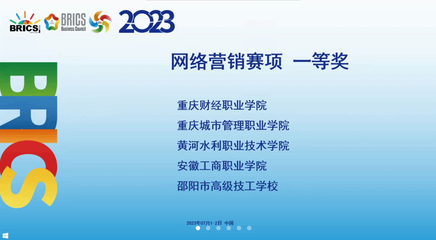 2023金砖国家职业技能大赛网络营销赛项全国选拔赛暨国内决赛已于7月1日-2日以“远程分布式”的方式在重庆财经职业学院顺利举办。经过两天的激烈角逐,我校管理学院张琰老师在全国决赛中荣获一等奖。据悉,她将代表中国队参加今年9月在南非举行的国际赛决赛。