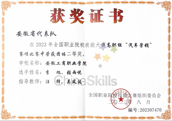 8月22日至25日全国职业院校技能大赛“汽车营销”赛项在河南交通职业技术学院举行,来自全国各省、自治区、直辖市和新疆生产建设兵团的68支参赛队参加比赛。管理学院由汪锋、吴风波两位老师指导,李旭、张雨悦组成的团队获得学生组赛项二等奖。