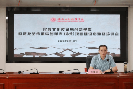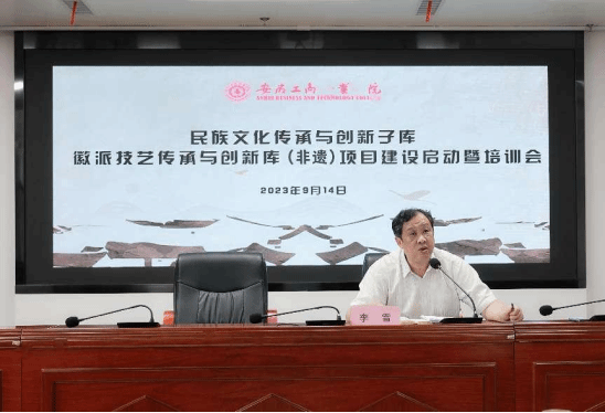 为推进教学资源库项目持续建设,加强各建设单位之间的交流,落实下一步建设任务,9月14日下午民族文化传承与创新子库-徽派技艺传承与创新库(非遗)项目建设启动暨培训会在我校综合楼举行。安徽工商职业学院校长李雪、副校长陈章奇、联合主持和参建单位的相关领导出席了会议,资源库建设各子项目负责人、课程建设负责人及资源库项目团队老师参加了会议。会议由副校长陈章奇主持。
