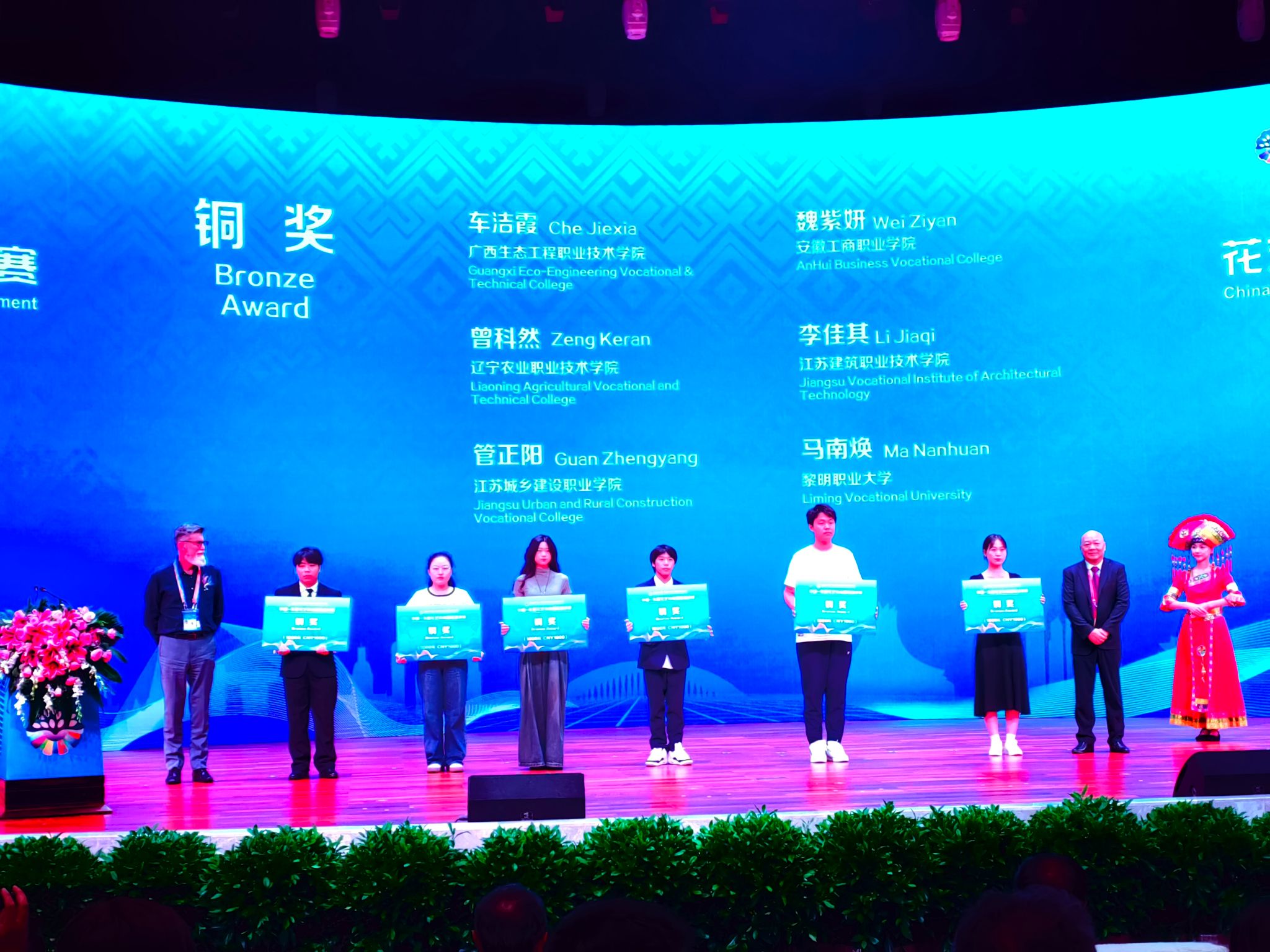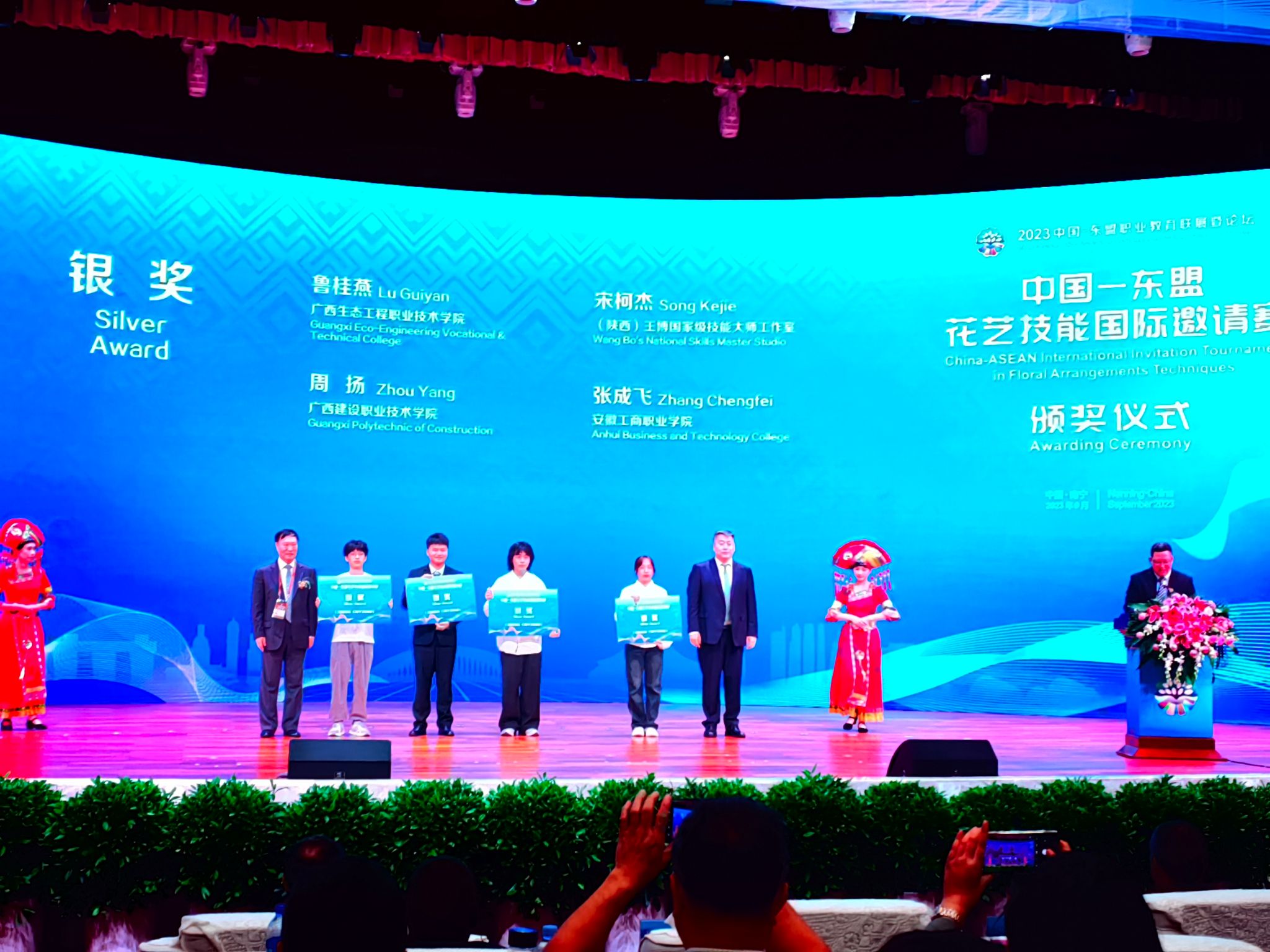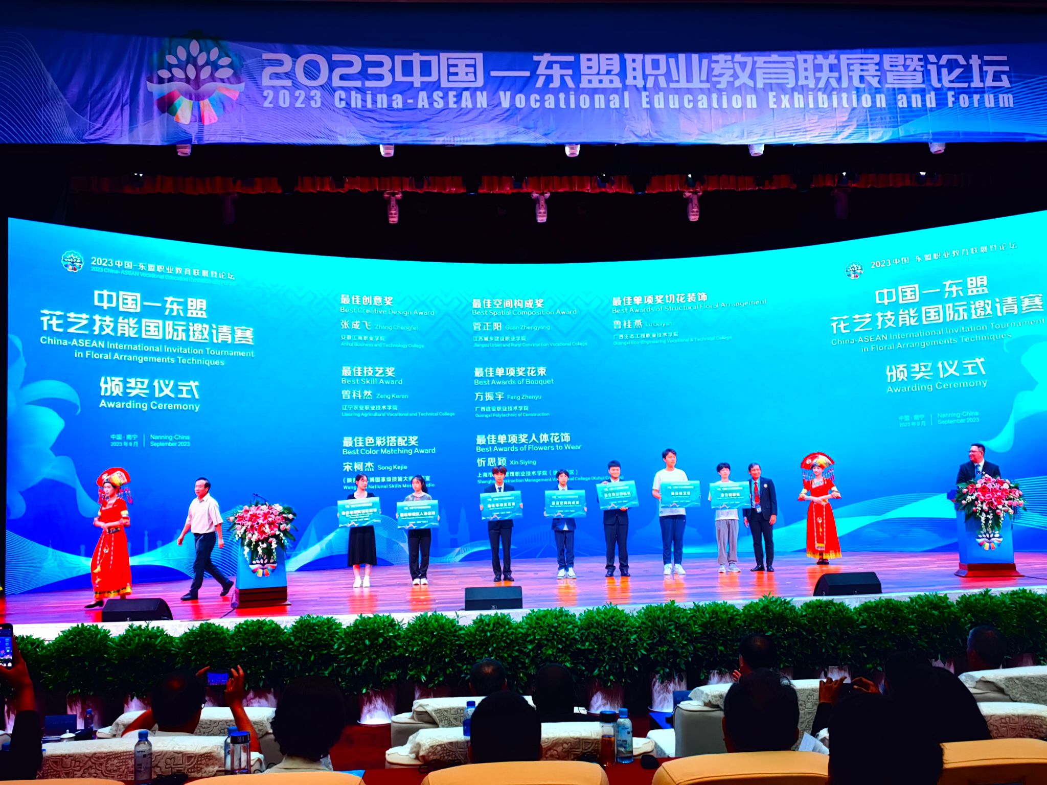 9月15日,由全国住房和城乡建设职业教育教学指导委员会指导,广西壮族自治区教育厅主办,广西建设职业技术学院承办的2023中国—东盟花艺技能国际邀请赛落下帷幕。我校艺术设计学院21级产品艺术设计专业张成飞获得银奖和最佳创意奖,22级产品艺术设计专业魏紫姸获得铜奖。这次国际邀请赛共有13个院校19位选手参赛,分别来自中国、日本、马来西亚等国家代表队参赛。安徽省仅有我校应中国住房和城乡建设部教指委邀请参赛。校党委委员、党委宣传统战部部长、艺术设计学院党总支书记孔成带队参赛并担任裁判。