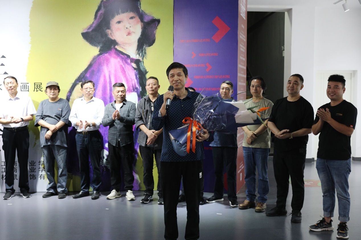 陈行代表学校对参加画展的嘉宾和兄弟院校师生们表示欢迎,并介绍了我校艺术设计学院的发展情况和哈春浪老师扎根教坛辛勤付出三十多年的工作历程,希望更多的社会力量参与学校教育教学,培养更多的艺术类人才。安徽省美术家协会原副主席陆小和、合肥师范学院美术与设计学院党委书记余洋、安徽省水彩画学会副主席秘书长左建华相继致辞,他们对此次展出的作品给予高度评价,肯定了哈春浪水彩画作品对美育工作的促进作用,并希望通过此次展览加强绘画创作领域的交流与合作。哈春浪老师致答谢词,左琪琨宣布“水趣横生--哈春浪水彩画展”开幕。