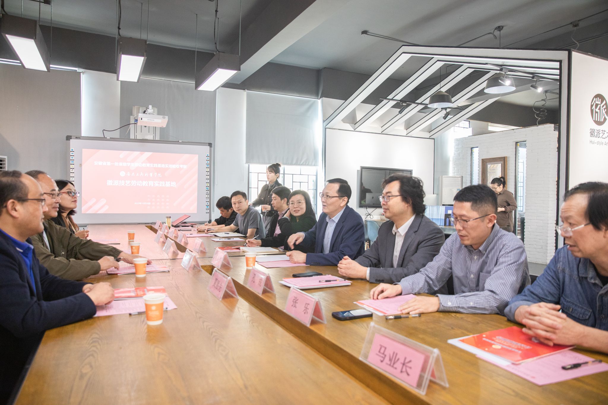 陈章奇代表学校对莅临我校验收专家们表示欢迎,并向专家组介绍了学校基本情况。孔成作徽派技艺劳动教育实践基地建设专题报告。报告分别从基地基本情况、工作开展情况、特色亮点、存在主要问题、下一步工作计划等五个方面进行汇报。我校徽派技艺劳动教育实践基地依托国家级徽派三雕技艺大师工作室及国家级教学资源库两个国家级资源支撑;开拓了《徽派三雕》、《徽派插花》、《徽派陶瓷》等11门劳动教育实践课程;建设40个徽派技艺工作室,场地面积达到15000平方,劳动实践教育设备齐全。基地依托国家级教学资源库相关徽派技艺的教学资源应用效果显著、劳动教育融入课程建设、发挥徽派技艺意匠讲堂及合瓦艺术馆展览文化在劳动教育中的地位和作用、以劳动教育促进专业实践教学;基地有专项经费投入保障机制。专家听取汇报后给予充分肯定,建议劳动基地应该扩大辐射面:辐射全校学生及周边中小学。同时提出传统的劳动教学方法无法适应当代学生,劳动基地应对劳动教育的形式及方案进行探索以适应当代学生的诉求。专家组根据《安徽省学生劳动教育实践基地建设与服务标准(试行)》逐一进行了查阅基地基础条件、运行条件、人员建设、保障措施等档案材料。