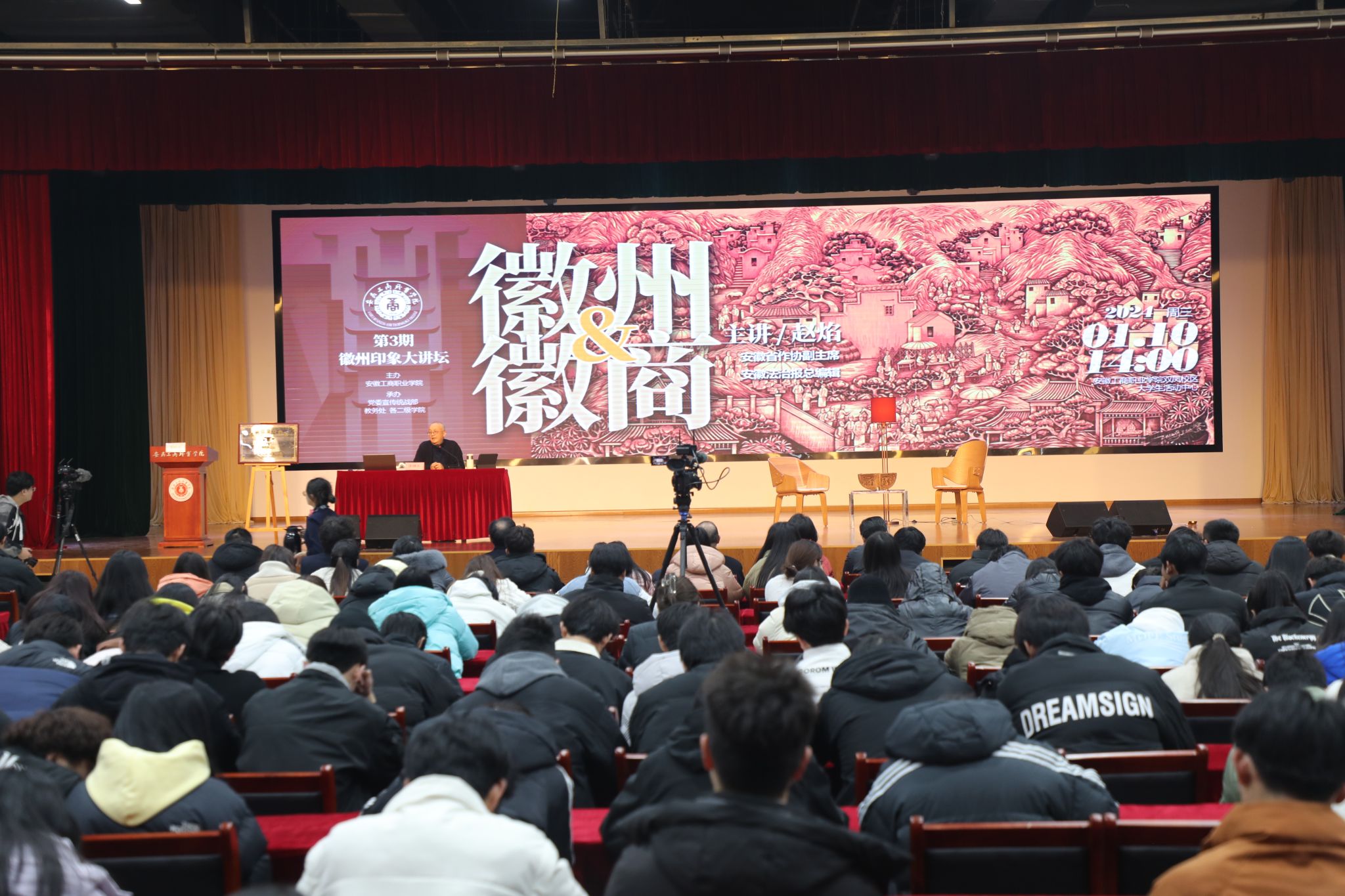 为贯彻落实习近平总书记在文化传承发展座谈会上的重要讲话精神,学习贯彻习近平文化思想,积极落实省委、省政府部署,让徽文化金名片成色更足更亮。1月10日下午,由安徽工商职业学院主办,校党委宣传统战部、教务处、各二级学院承办的第三期徽州印象大讲坛“徽州与徽商”在大学生活动中心成功举办。本次讲座特邀安徽省作协副主席,安徽法治报总编辑赵焰担任主讲嘉宾。中新社国际传播集团安徽分公司总经理成展鹏,合肥晚报、江淮晨报副总编、集团视觉融媒体中心主任罗杰,《中国教育报》安徽记者站方梦宇受邀参加。校党委书记齐建平,党委副书记、院长李雪,党委委员、党委副书记陈行,党委委员、党委宣传统战部部长孔成出席了本次活动。各部门、职能处室、二级学院负责人,教师,学生代表500余人现场参加了本次讲座。讲座同步在线直播,线上观看人次高达2000人。讲座由校党委宣传统战部胡佩佩主持。