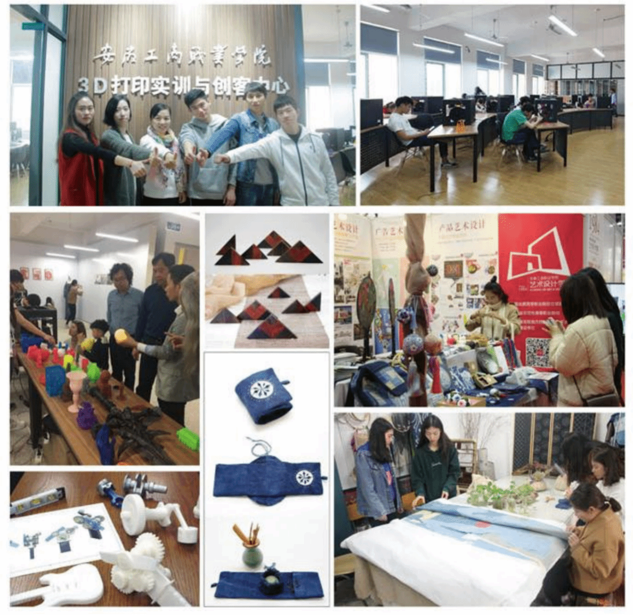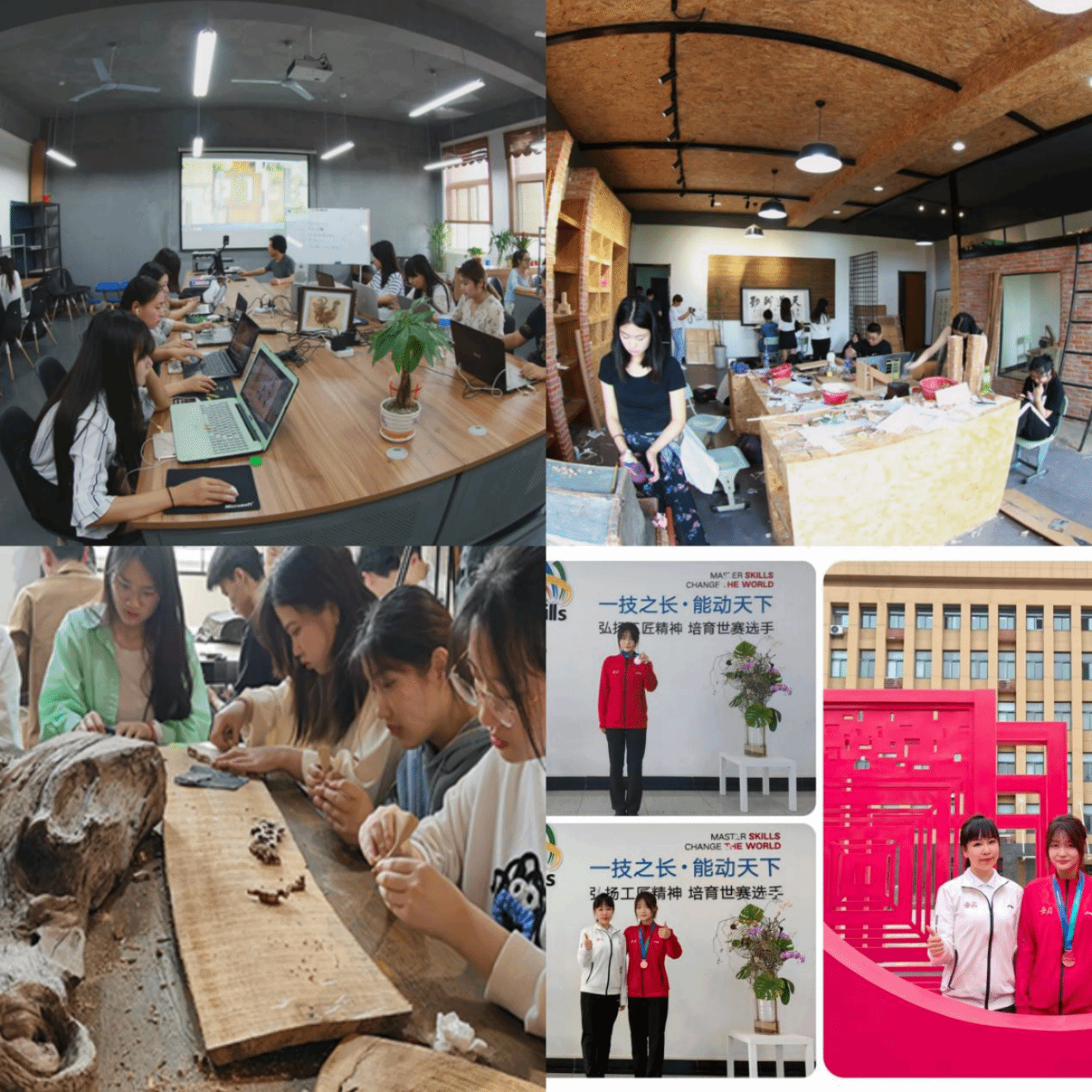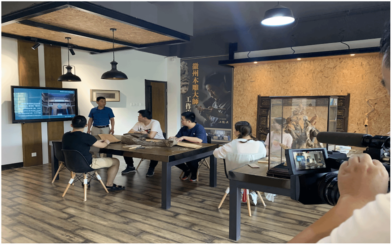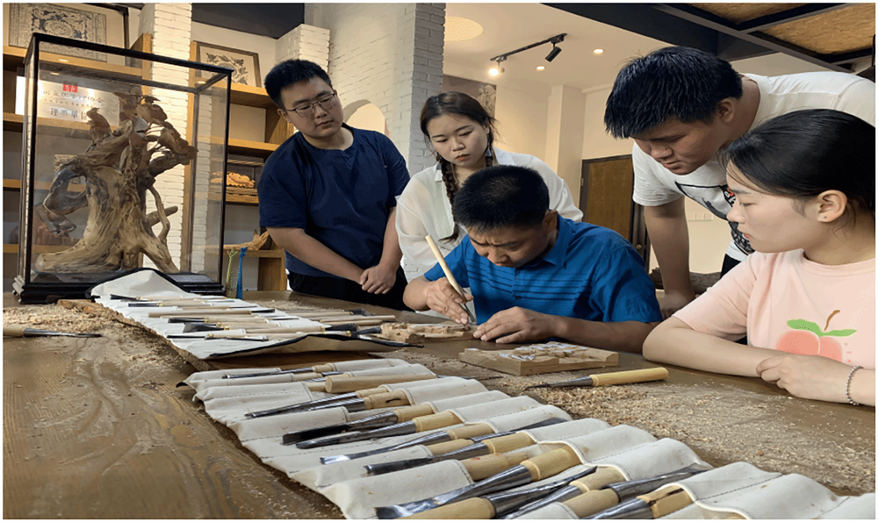 学校设立阶段学习、实践、交流与展示一体化的技艺工作坊,面向全校学生选拔对雕刻、陶瓷等有一定基础、有浓厚兴趣的学生参与学习,由技艺大师亲自执教,培养学生持续发展的能力。团委牵头与二级学院团总支,联合建立徽派雕刻传承项目兴趣小组和学生社团,在大师指导下开展自主学习、互助学习、展览交流等丰富多彩的实践活动,建立艺术爱好俱乐部,拓展徽派雕刻的专业类型,从砖雕、石雕、木雕,拓展到歙砚、玉雕、竹雕、陶艺、花艺等领域,形成技艺传承矩阵。在艺术设计类专业中增设专业课程《徽派创新设计》,发挥艺术设计专业服务地方的优势,推动徽派技艺传承与创新融入专业教学,提升学生专业素养。