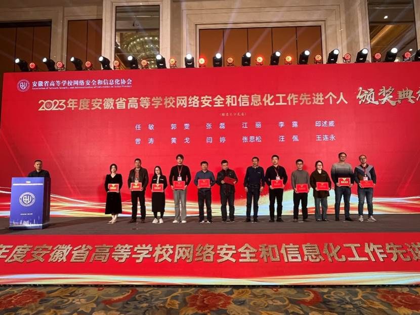 本次会议就教育数字化转型、智慧校园建设、网络安全管理等方面对全省高校信息化工作重点进行了研讨,对2023年全省网络安全和信息化工作表现优异的集体和个人进行了表彰。我校因网络安全和信息化工作成绩突出,继2016、2017、2018、2020、2022年获奖后,再度荣获2023年度安徽省高校网络安全和信息化工作先进集体,张磊老师被评为2023年度安徽省高校网络安全和信息化工作先进个人。