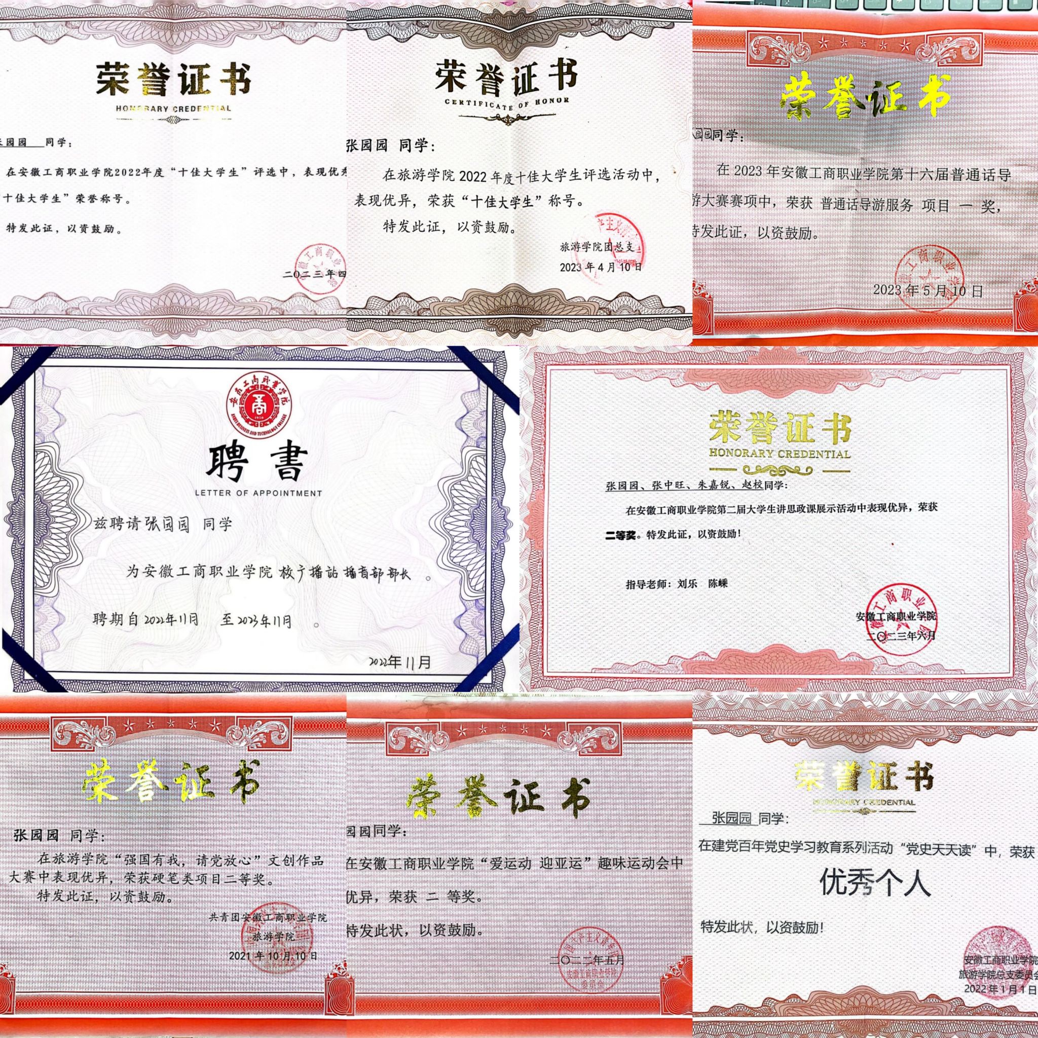 1000多道理论题的磨炼、数百遍的导游词推敲、500多篇的专题讲解词淬炼,导游词背了忘忘了再背、一遍遍的走位和体态练习、无数次深夜的讲解视频录制……她有过“痛苦”,更有过“崩溃”。时间是最好的见证,夜以继日地练习,张园园从一开始对专业的懵懵懂懂,到越发自信地站在各大比赛的舞台中央,从容且坚定。2022年,她获得全国职业技能大赛“导游服务”赛项三等奖,安徽省一等奖第一名的好成绩。2023年获得全国职业技能大赛“导游服务”赛项二等奖、安徽省职业技能大赛“研学旅行”赛项一等奖、长三角旅游职业教育联盟“我为家乡代言”一等奖第一名、2023年合肥市导游讲解员大赛“中文组”银奖等等。