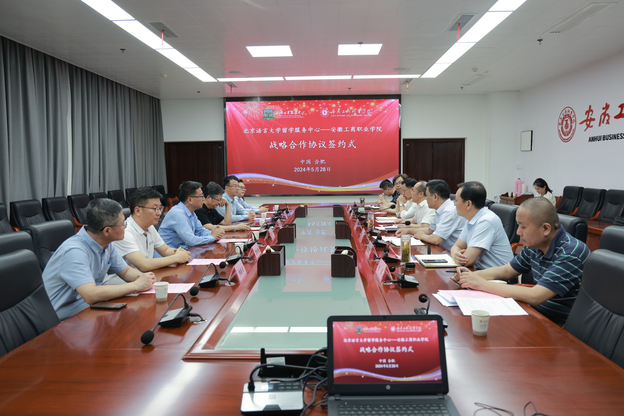 在与会领导的见证下,北京语言大学留学服务中心主任助理贾永生和安徽工商职业学院党委委员、党委宣传统战部部长孔成分别代表双方单位在战略合作协议书上签字。