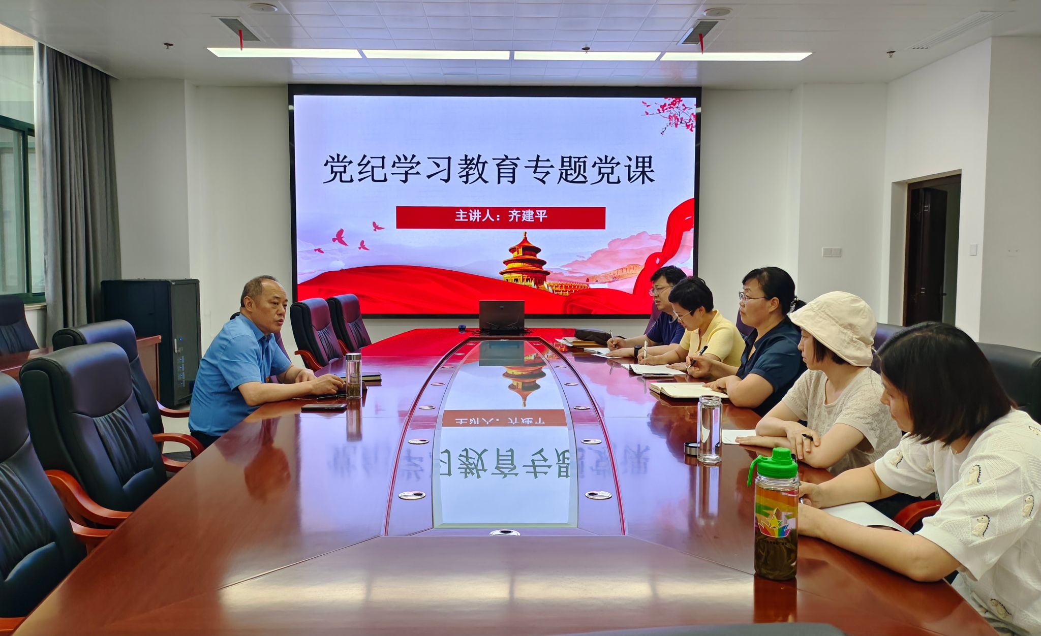 6月19日中午,校党委书记齐建平在综合楼1号会议室,为工程管理教研室党支部全体党员同志上了一堂生动且富有指导意义的党纪学习教育专题党课。
