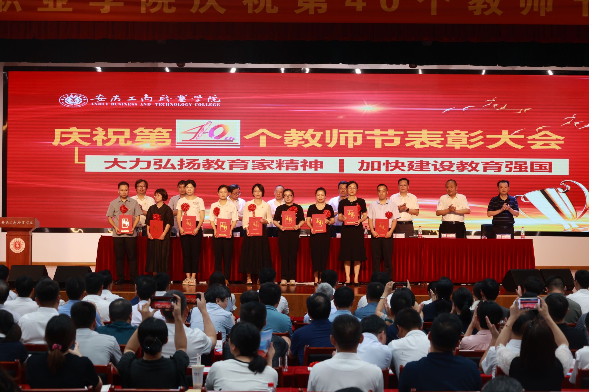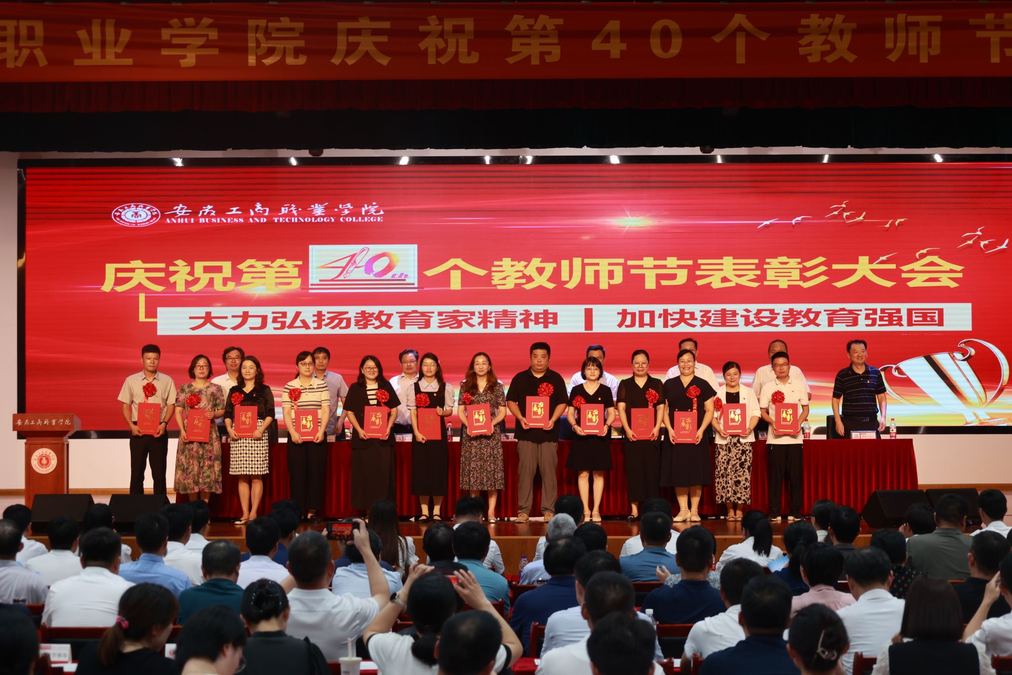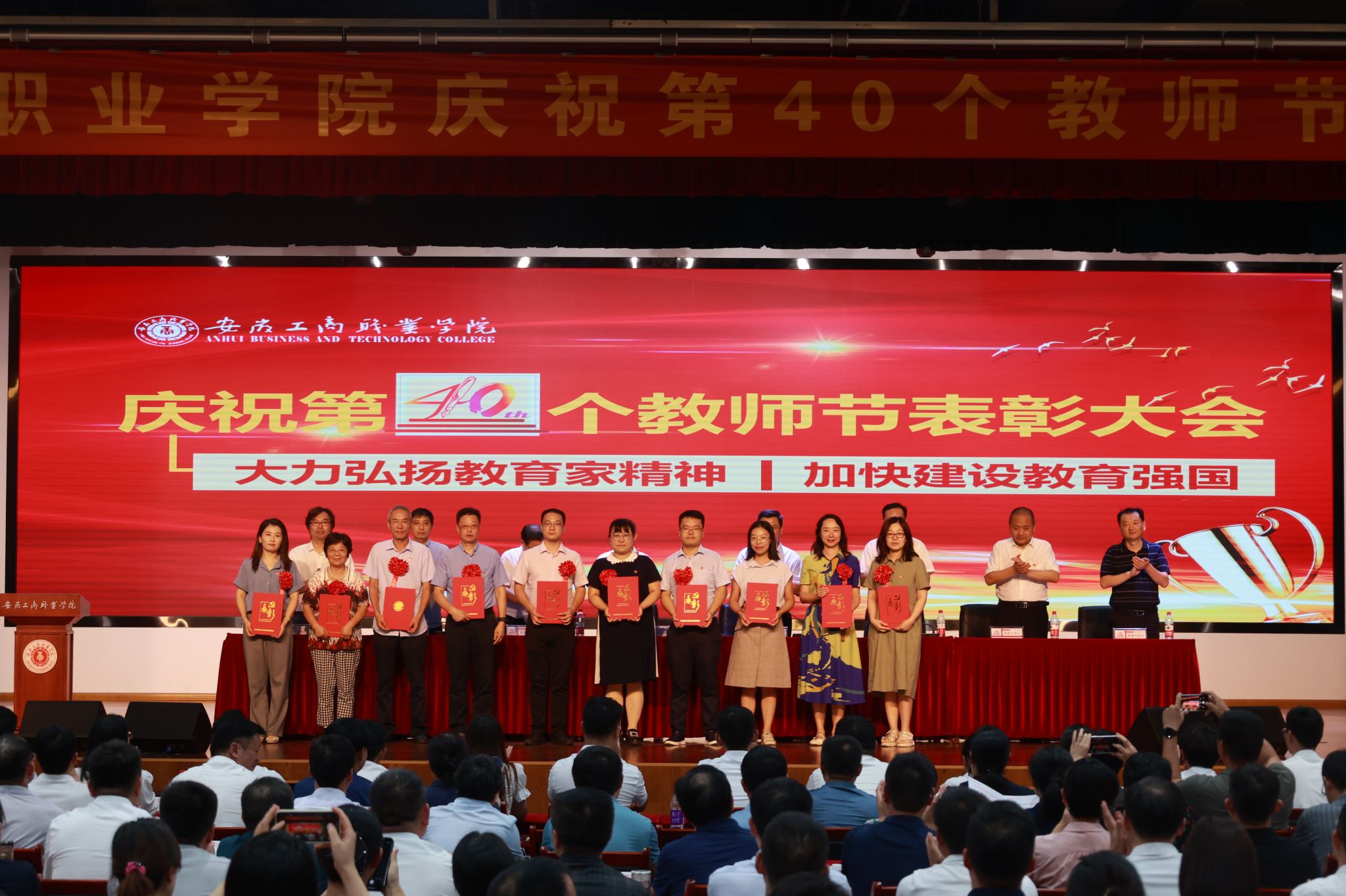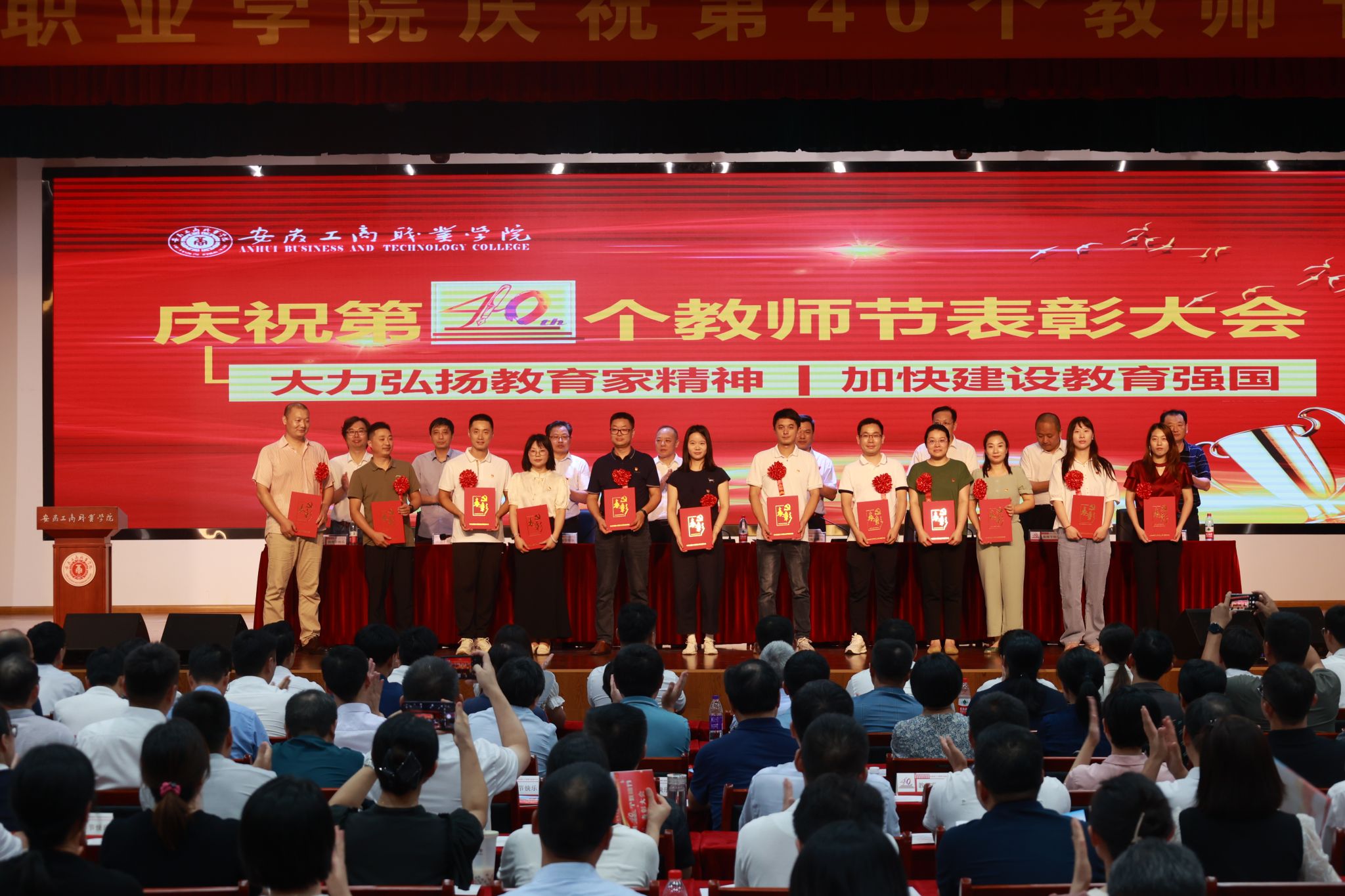 9月10日下午,学校在双凤校区大学生活动中心举行“大力弘扬教育家精神,加快建设教育强国”----安徽工商职业学院庆祝第40个教师节表彰大会。校党政领导班子、全体教职工和部分学生代表参加大会,大会由校党委副书记陈行主持。