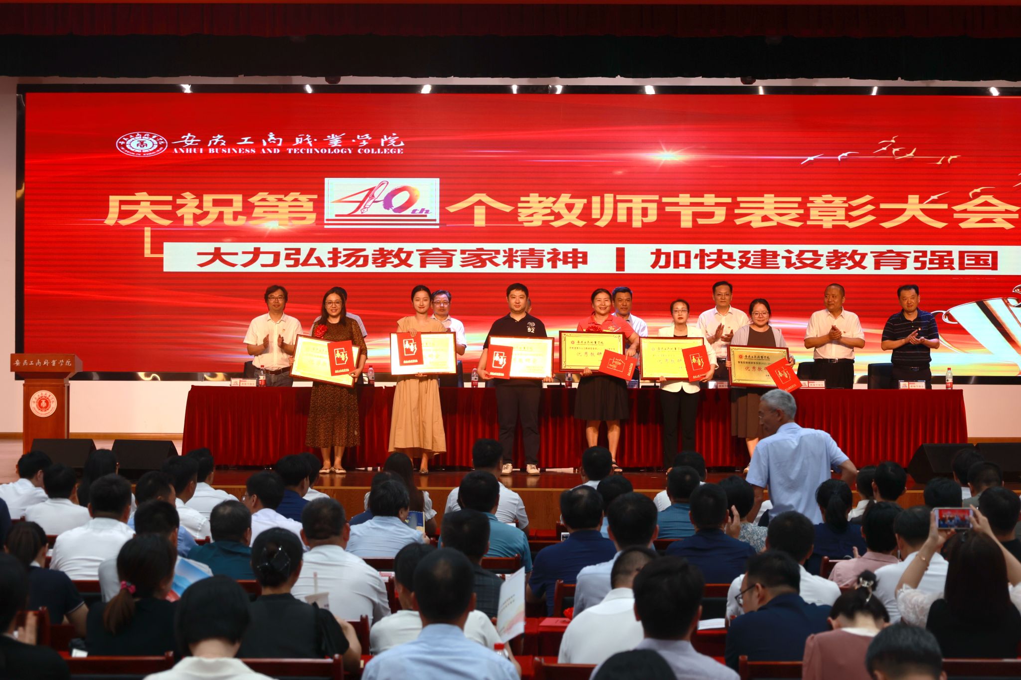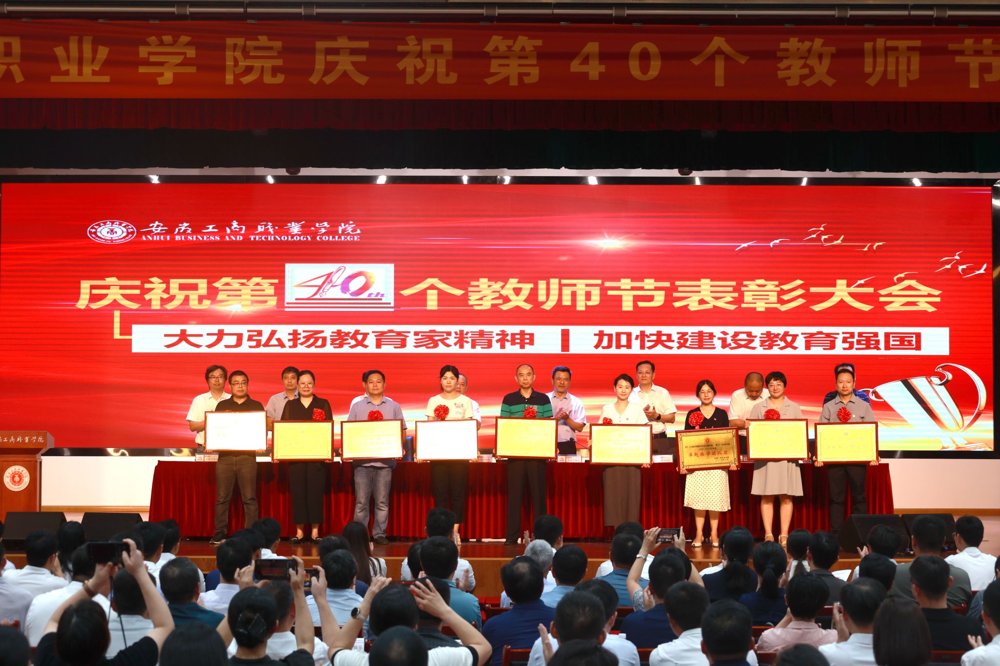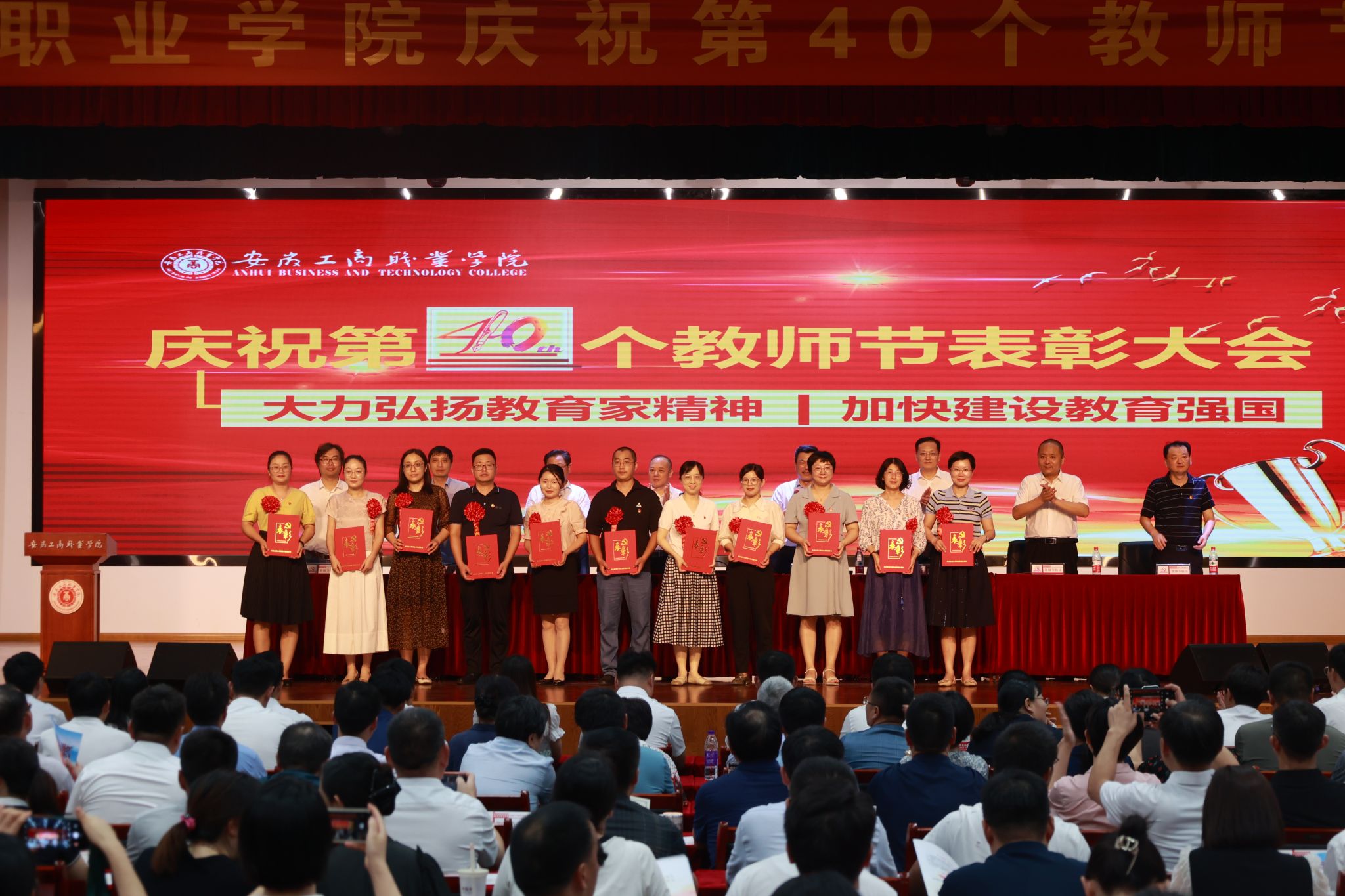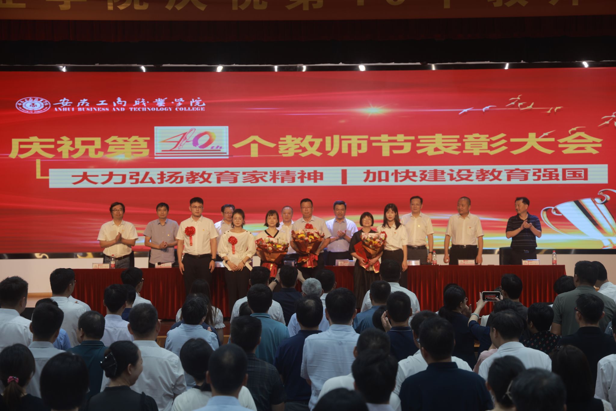 9月10日下午,学校在双凤校区大学生活动中心举行“大力弘扬教育家精神,加快建设教育强国”----安徽工商职业学院庆祝第40个教师节表彰大会。校党政领导班子、全体教职工和部分学生代表参加大会,大会由校党委副书记陈行主持。