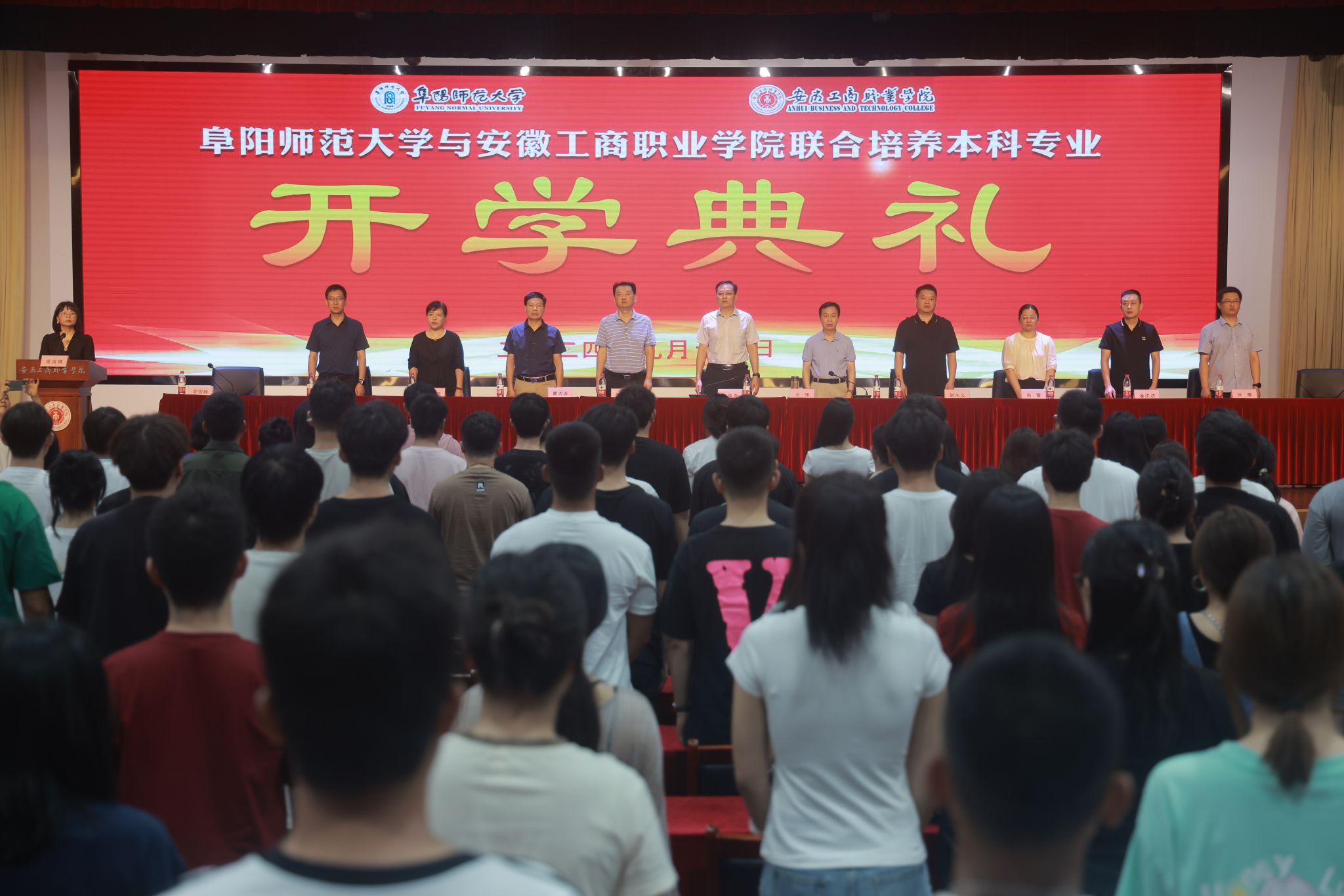9月11日上午,阜阳师范大学与安徽工商职业学院专升本联合培养2024级新生开学典礼在我校双凤校区大学生活动中心隆重举行。阜阳师范大学党委委员、招生就业处处长方强一行5人出席典礼,我校党委委员、副院长陈章奇,校党委委员、管理学院院长朱小龙出席典礼,相关二级学院、职能处室负责人,本科班辅导员、任课教师和全体115名新生同学参加了典礼,典礼由教务处副处长郭雪峰主持。