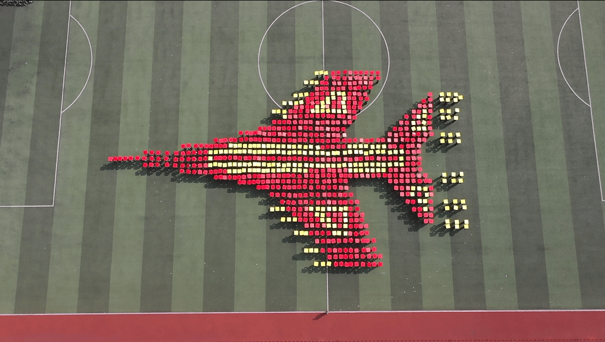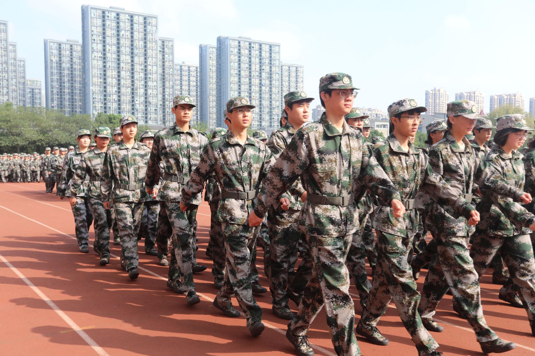 军训汇报表演在庄严的国歌声中伴随冉冉升起的国旗拉开序幕。五千多名参训新生雄姿英发、精神飒爽,以整齐的方队和步伐,紧随宏大的国旗方阵,依次走过主席台接受检阅。方队队形展示、军体拳、军歌大合唱等精彩表演,带来一场震撼的视觉盛宴。同学们以饱满的精神展示学院军事训练和国防教育的成果。