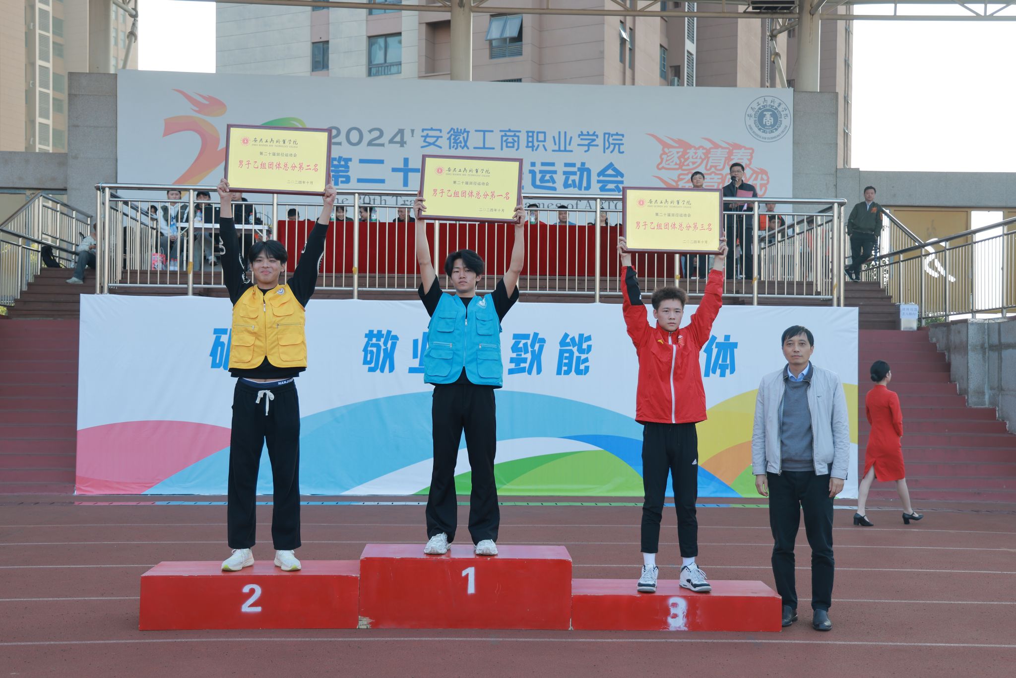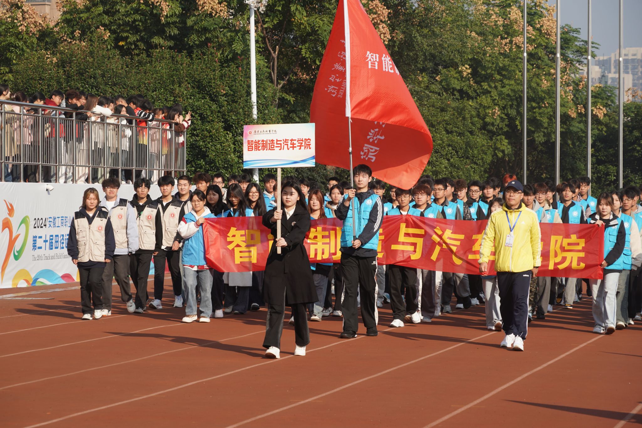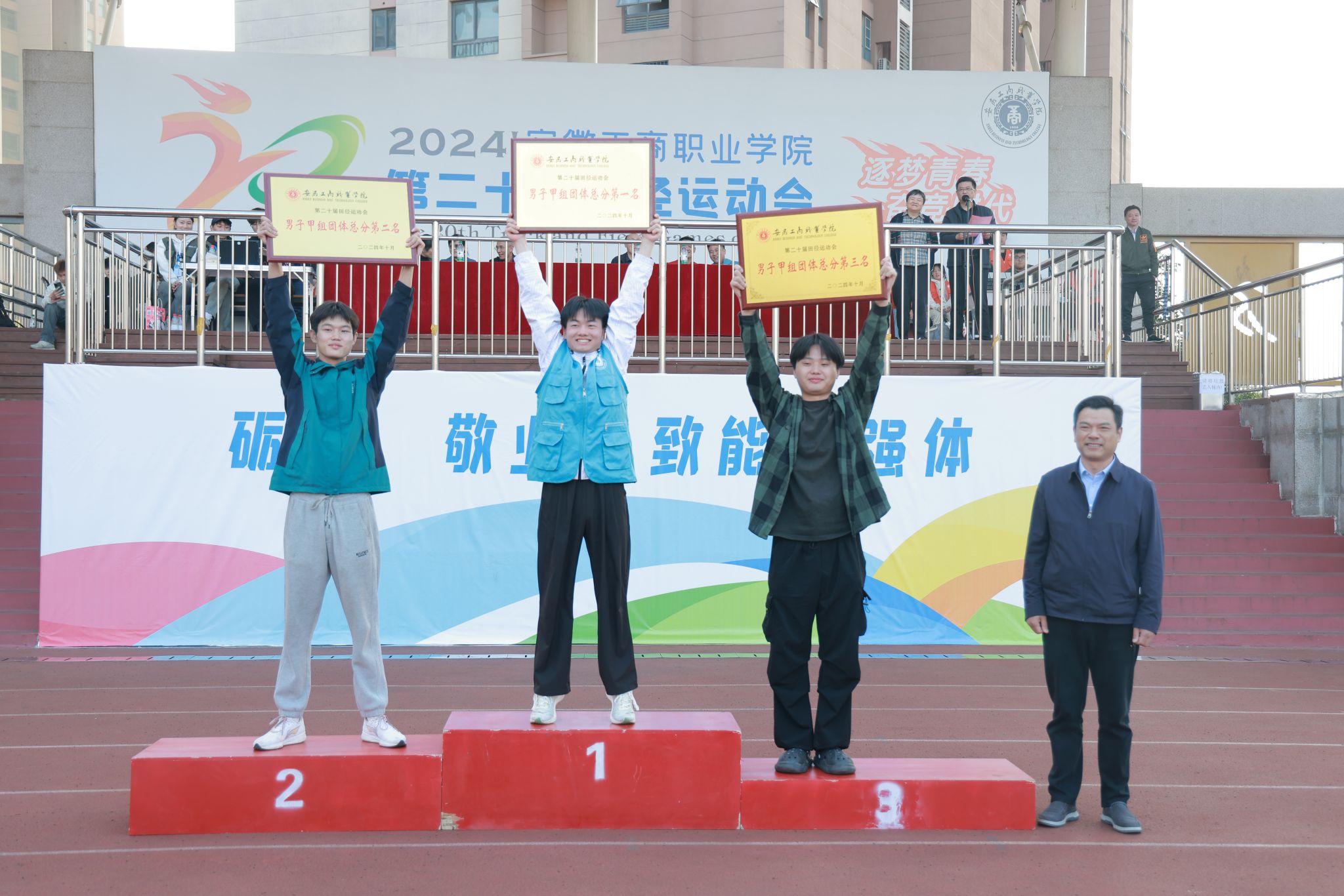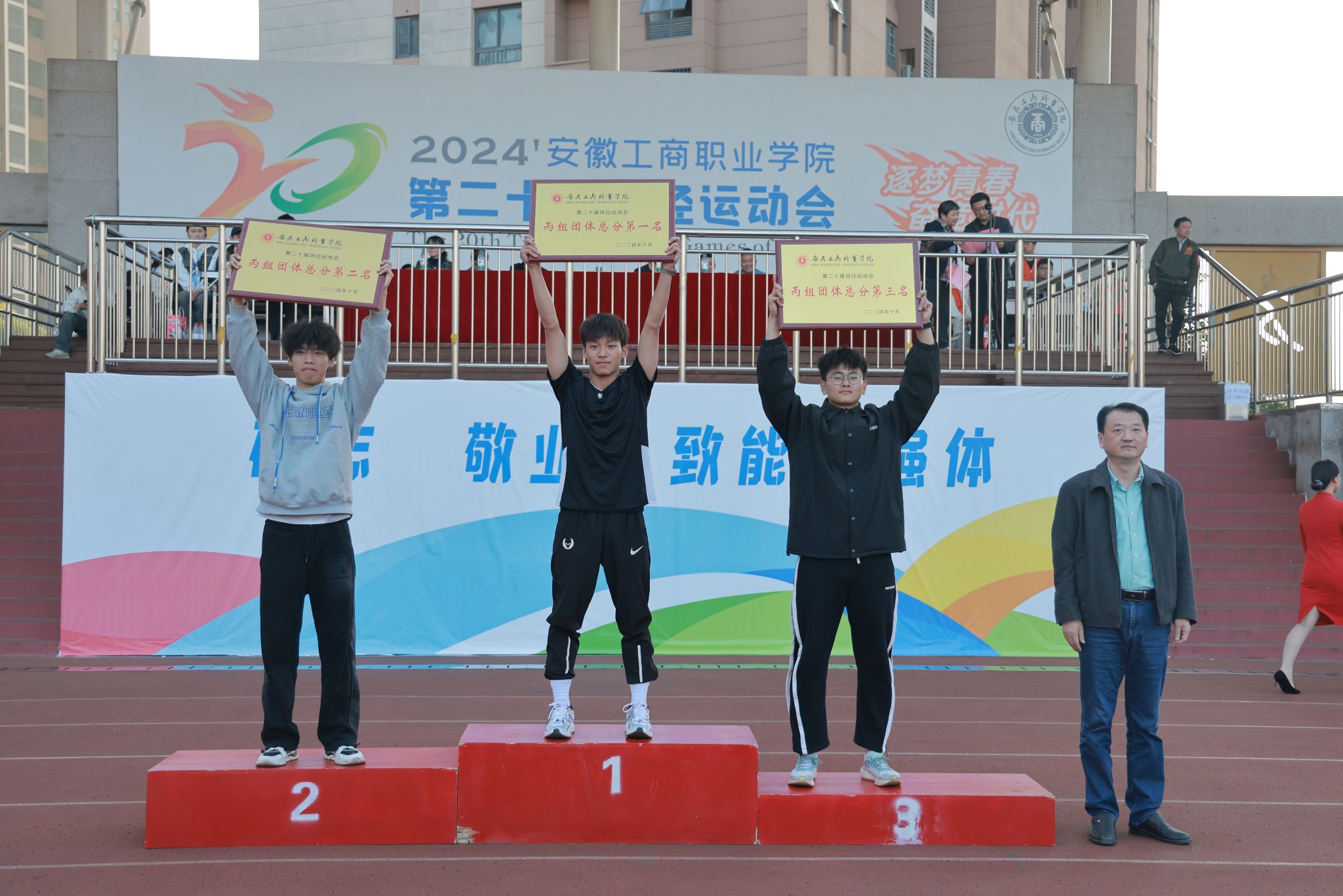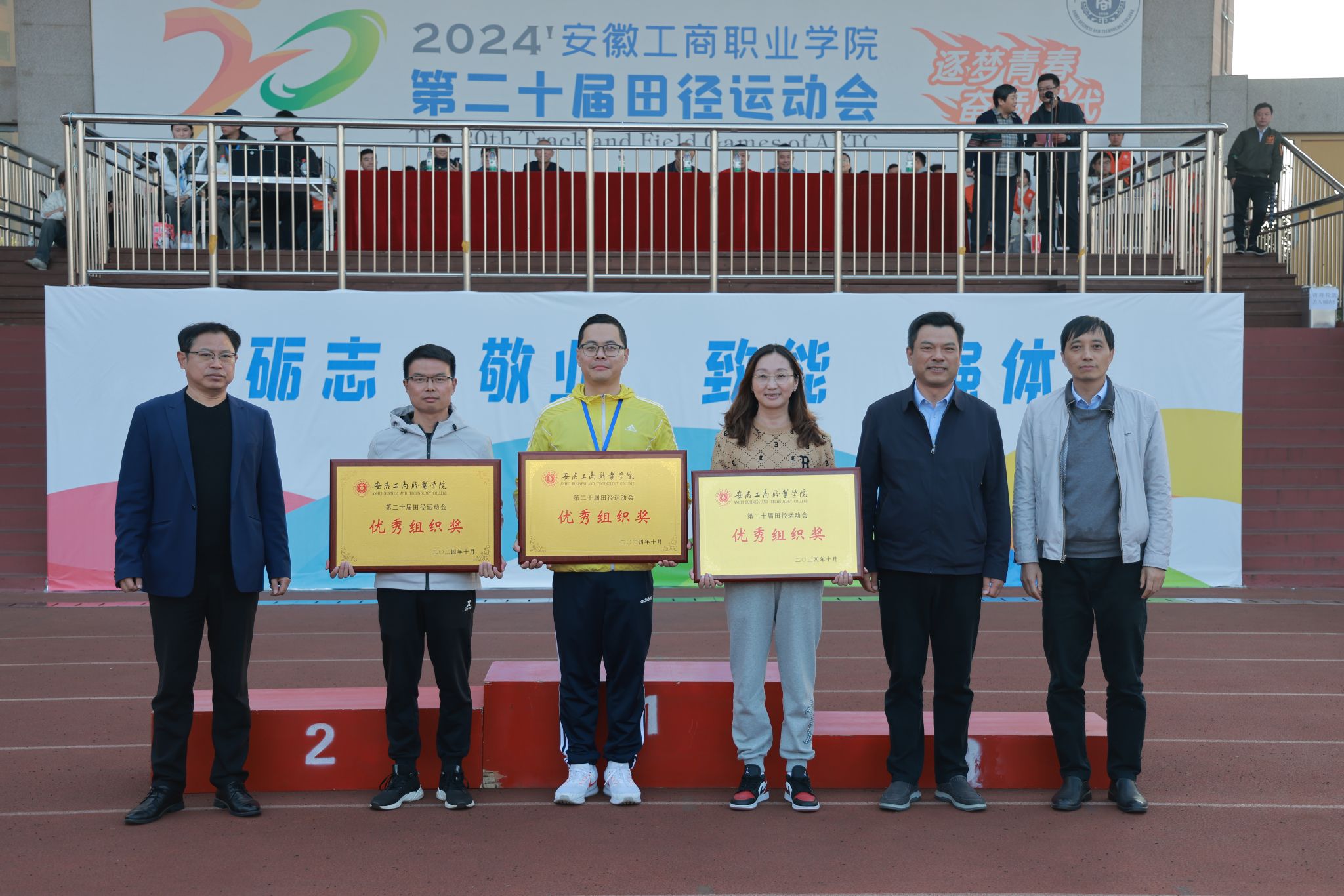 10月24日,学院第二十届田径运动会闭幕式在田径运动场举行。学院党政班子陈行、胡捍东、吴松飞、孔成、朱小龙莅临现场。闭幕式由运动会总裁判长、教务处长张震主持。副总裁判长刘守旺公布本次比赛中各团体的成绩以及刷新纪录3名运动员名单与成绩智能制造与汽车学院、管理学院和艺术设计学院获得优秀组织奖。随后,在全场热烈掌声中,学院领导为获奖团体和运动员颁发奖项。