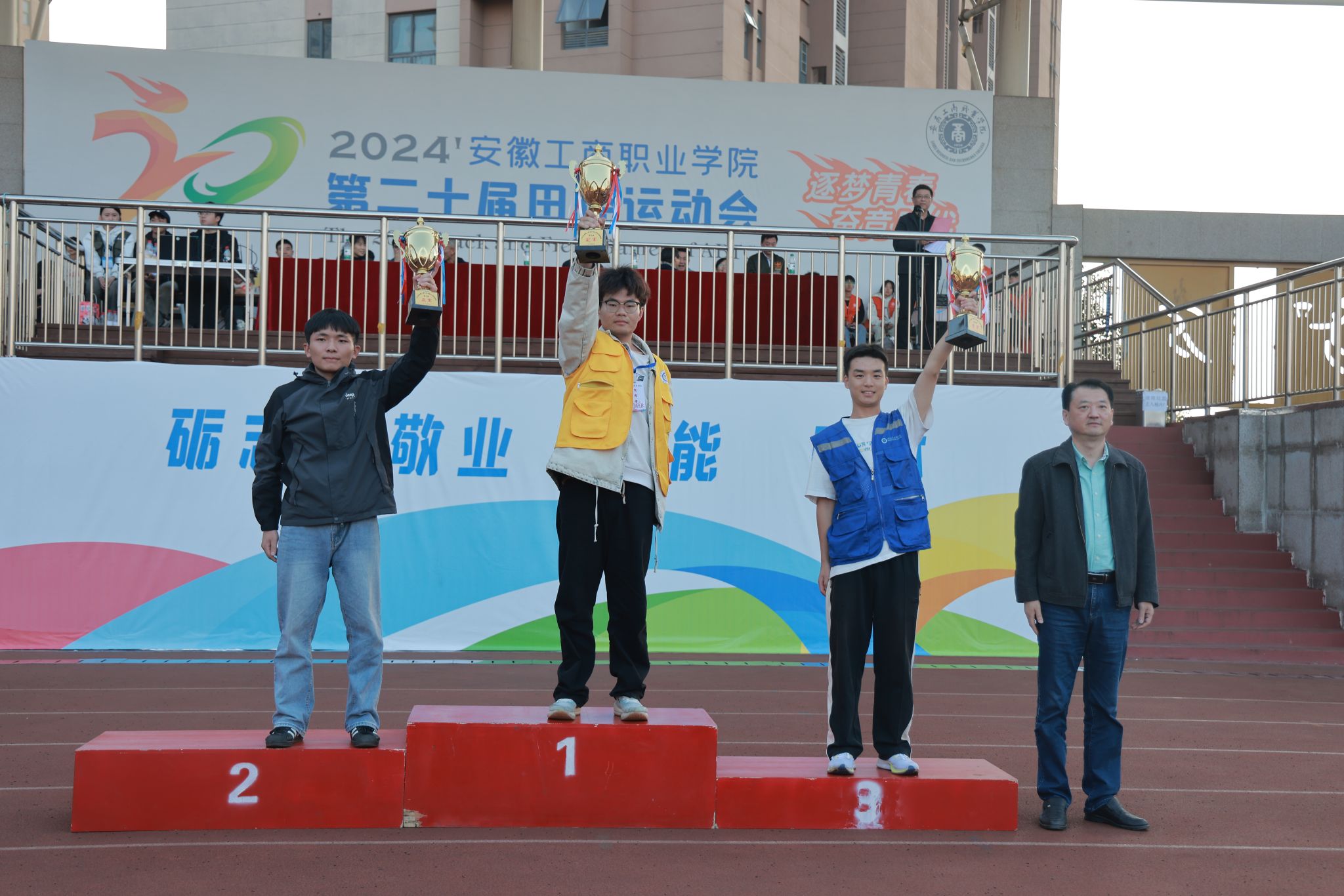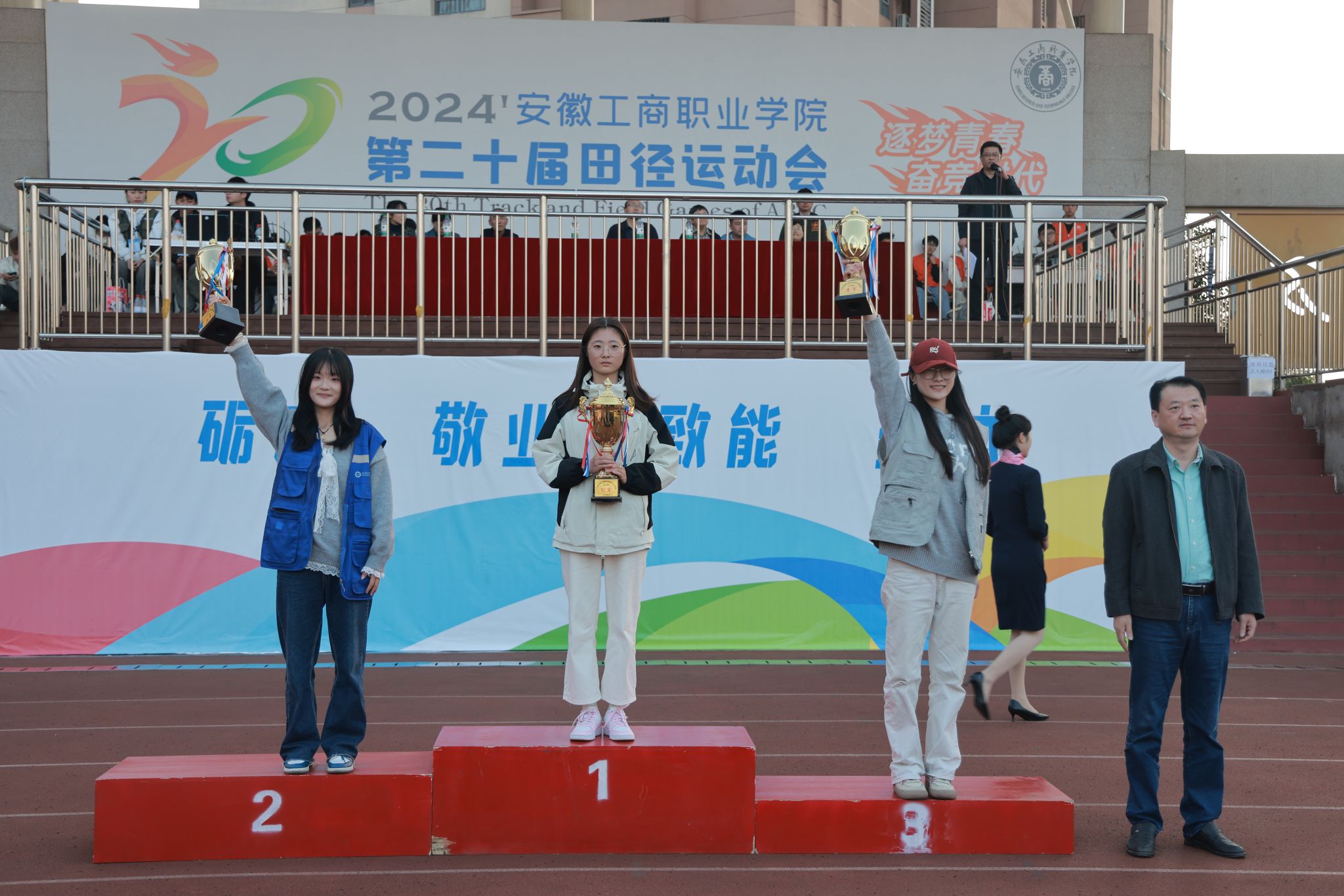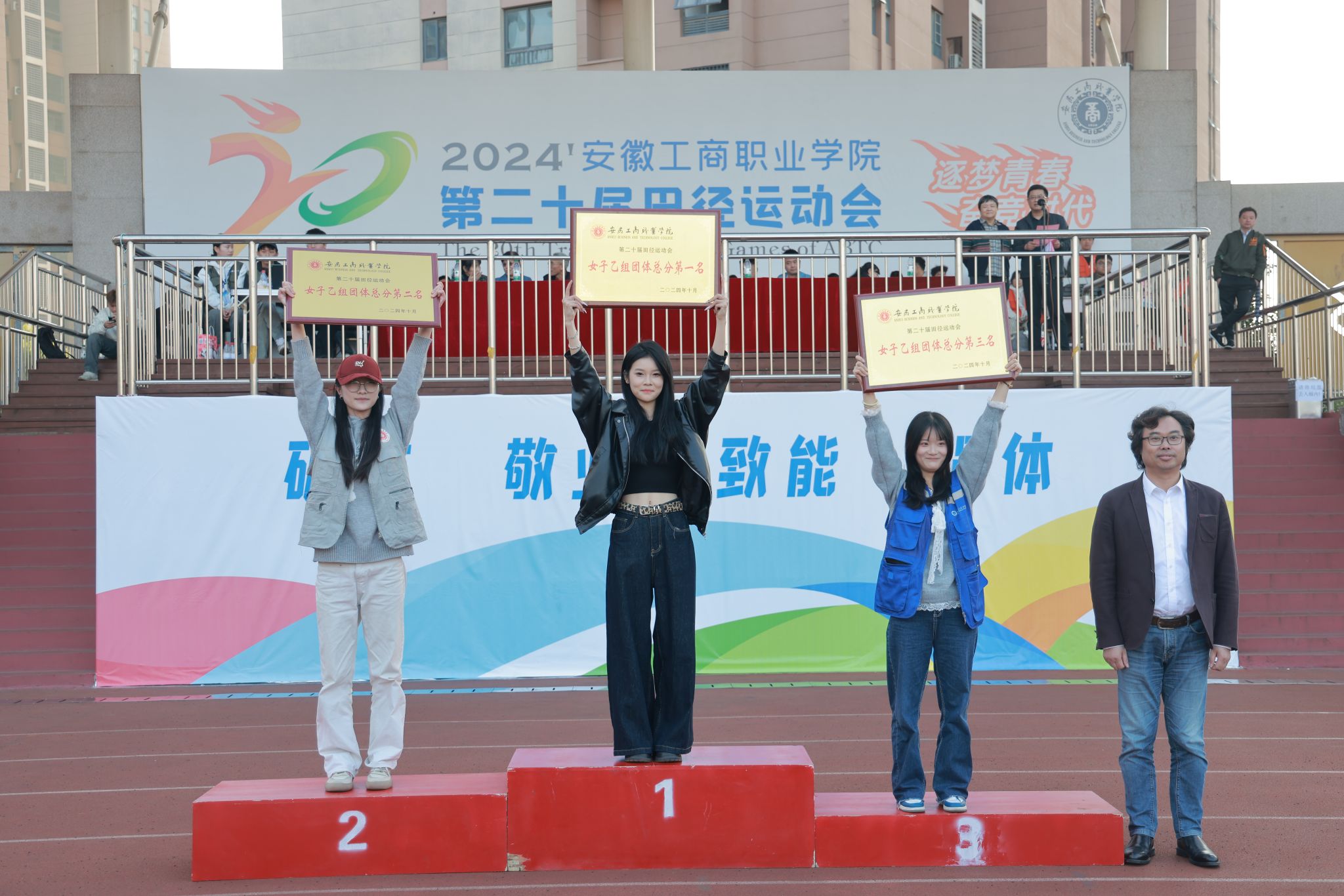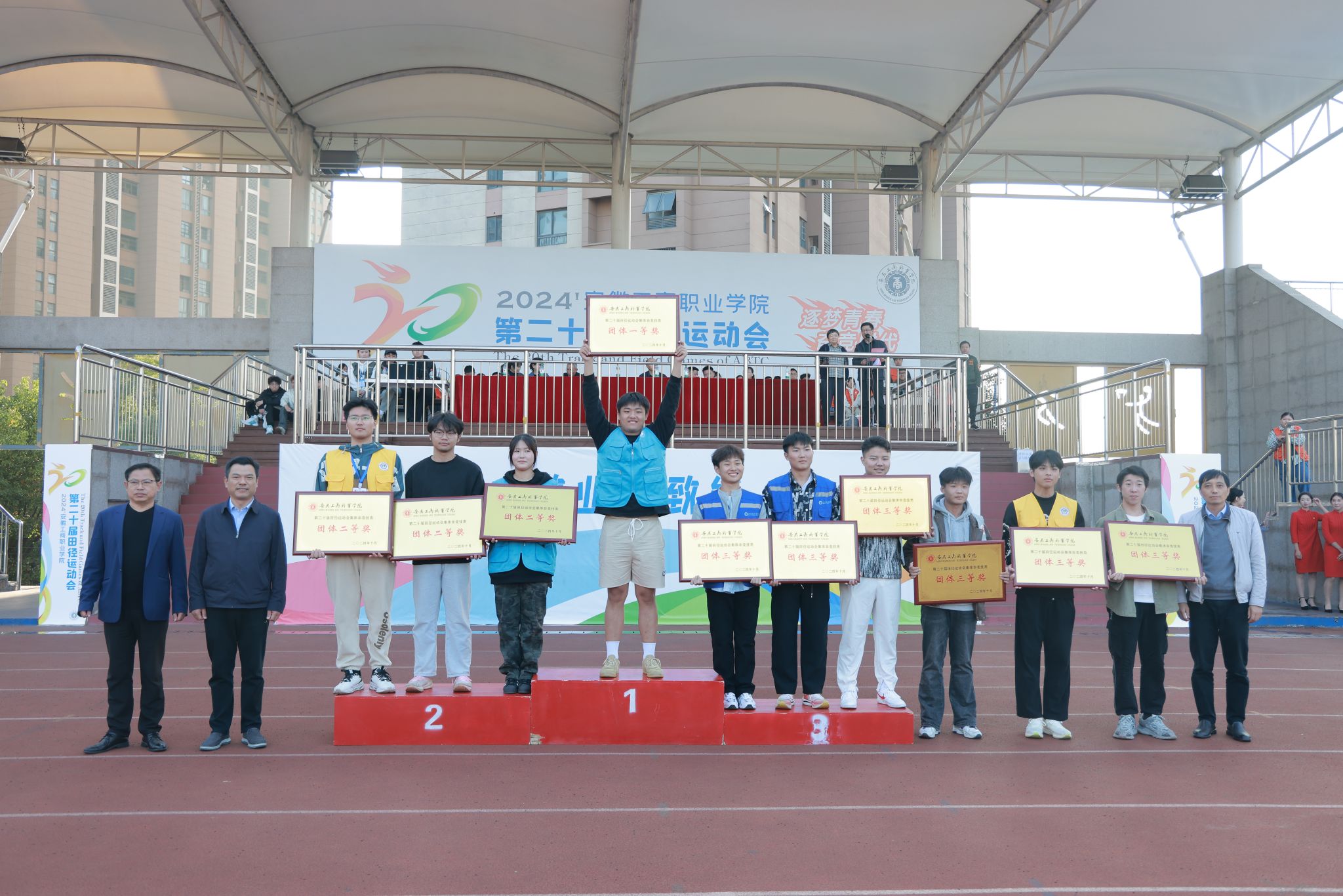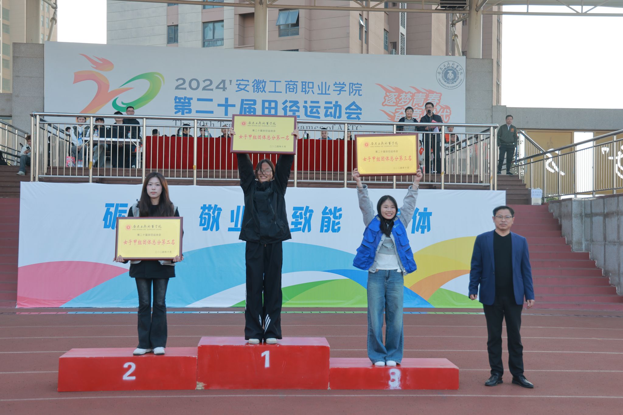 10月24日,学院第二十届田径运动会闭幕式在田径运动场举行。学院党政班子陈行、胡捍东、吴松飞、孔成、朱小龙莅临现场。闭幕式由运动会总裁判长、教务处长张震主持。副总裁判长刘守旺公布本次比赛中各团体的成绩以及刷新纪录3名运动员名单与成绩智能制造与汽车学院、管理学院和艺术设计学院获得优秀组织奖。随后,在全场热烈掌声中,学院领导为获奖团体和运动员颁发奖项。