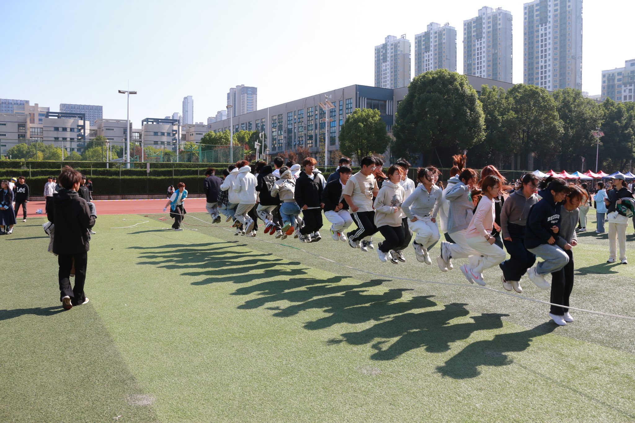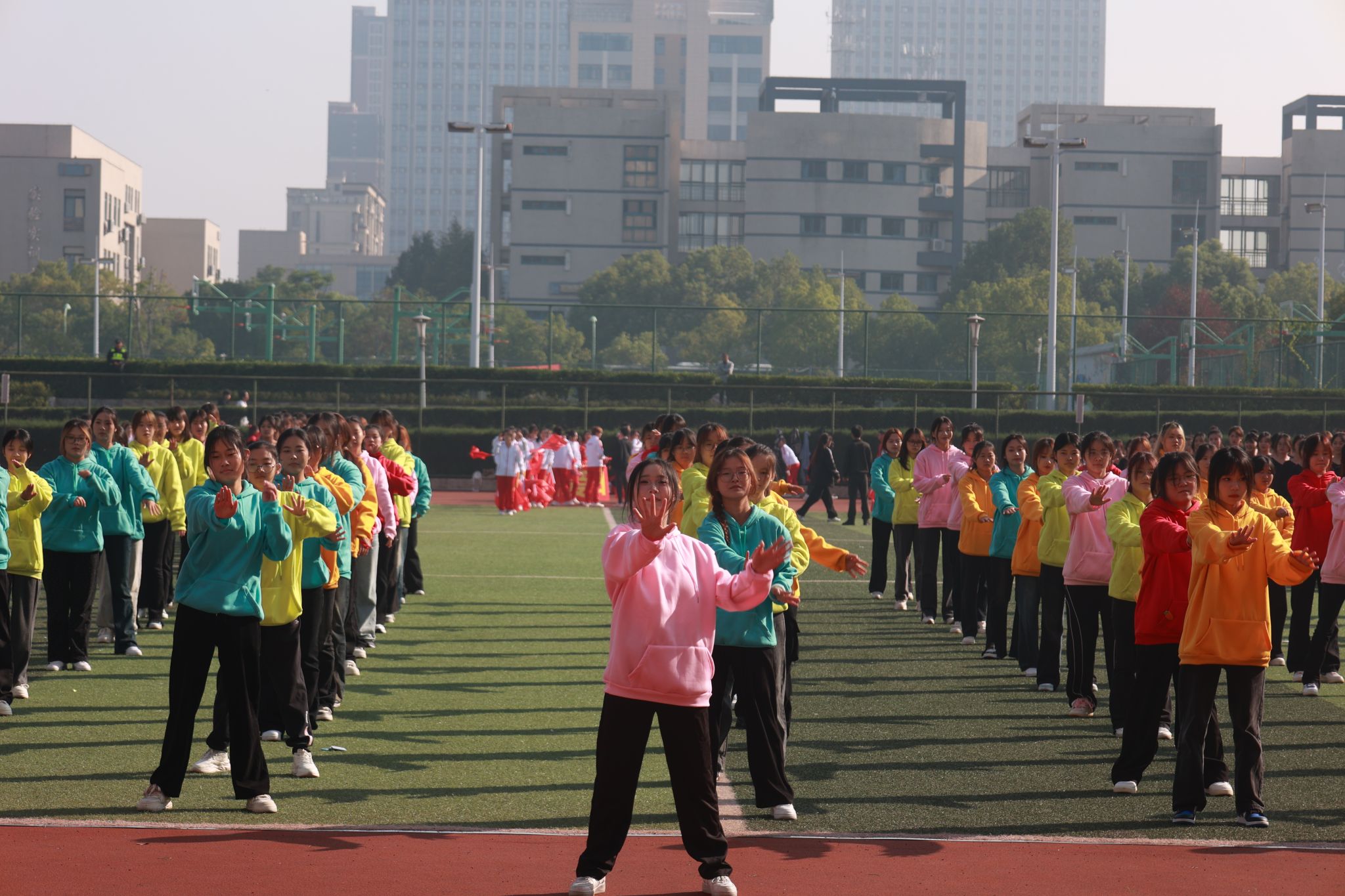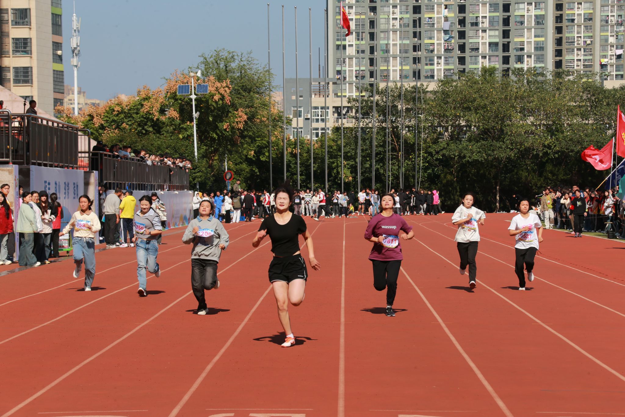 本届运动会吸引了来自全校7个代表队共1100名运动员的热情参与,在包括田赛、径赛及体质健康全能三大类别的16个小项中展开了激烈角逐。此外,还有700名同学以团体形式参加了三项非竞技性质的集体项目,充分展现了团队协作的力量与魅力。