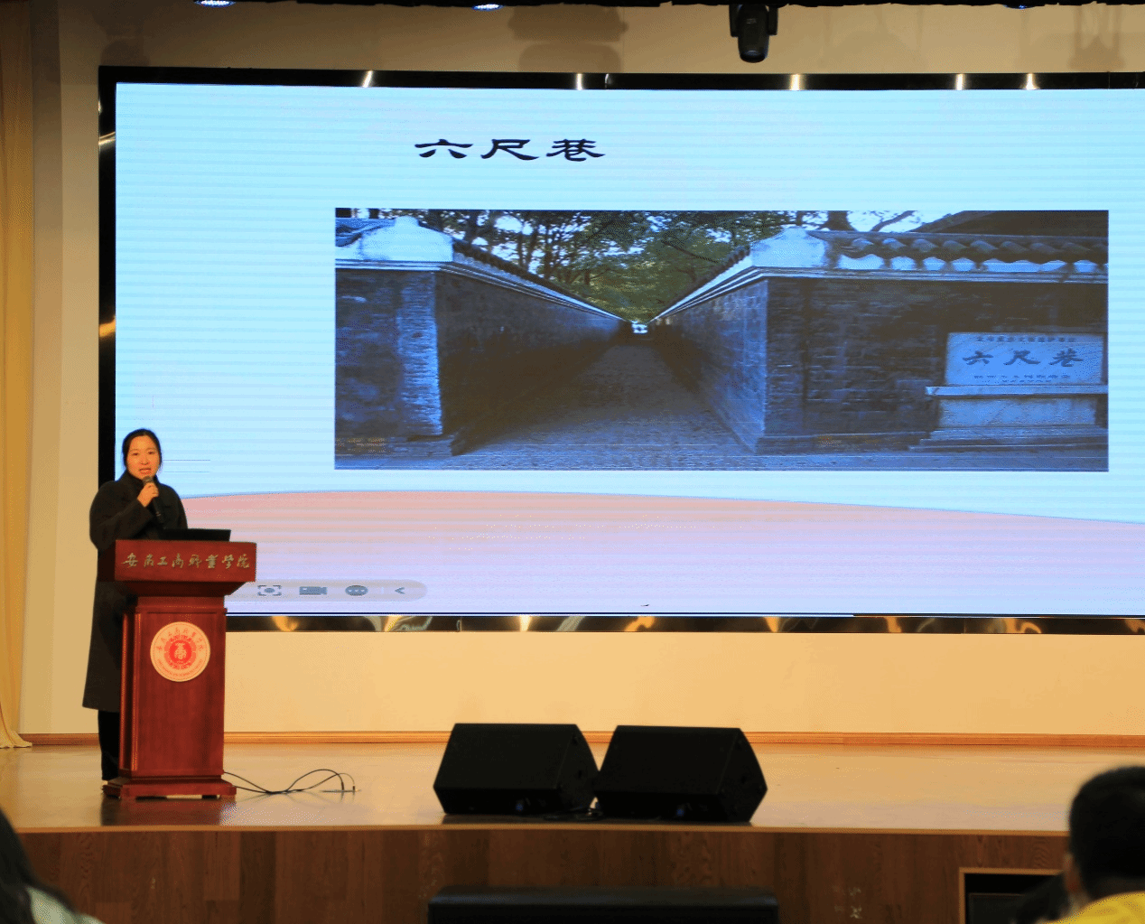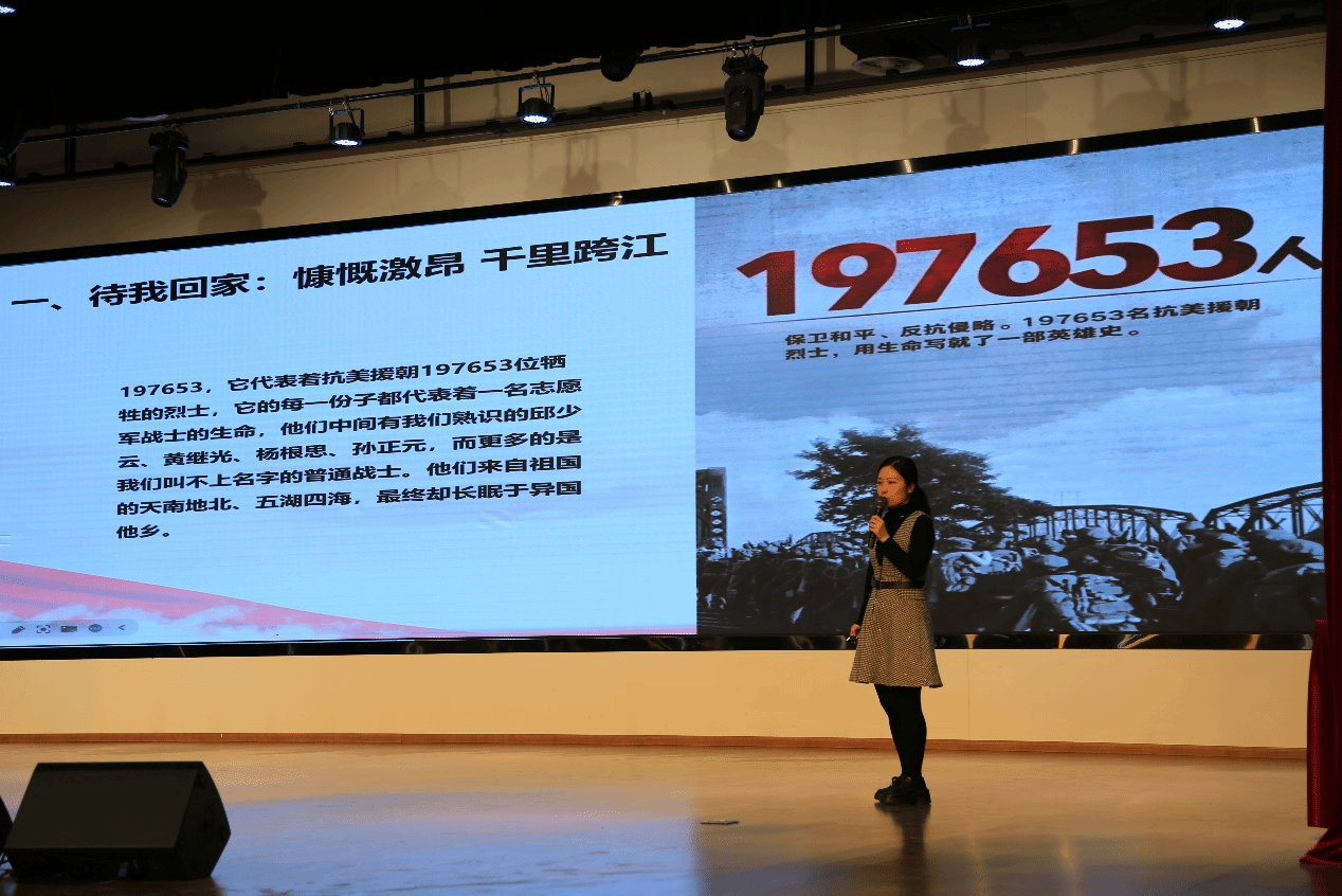 首先登场的是马克思主义学院的陈慧老师,她以《致敬抗美援朝,争做时代新人》为主题,结合抗美援朝的英雄事迹,深入浅出地讲解了新时代青年的责任与担当,赢得了现场热烈掌声。