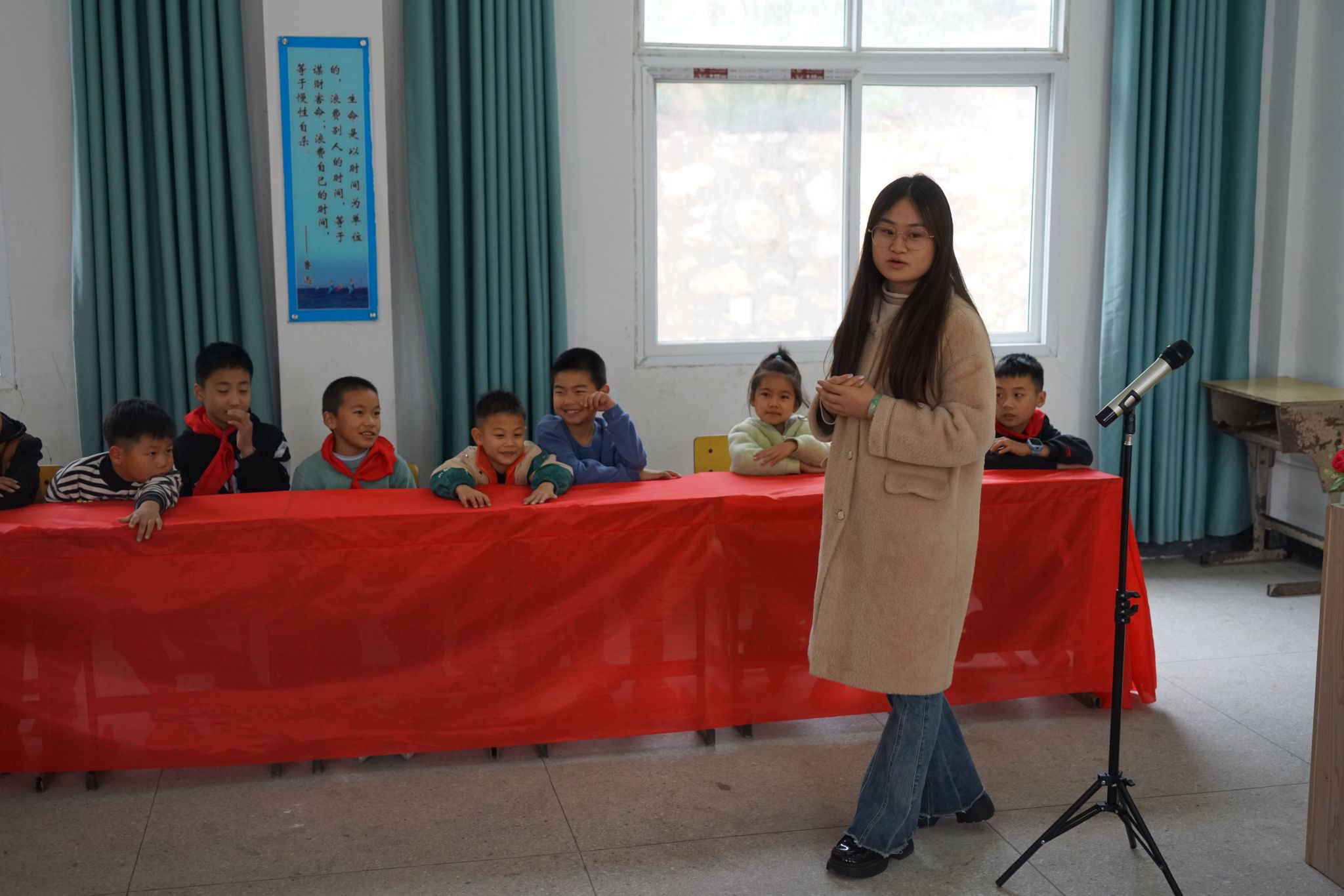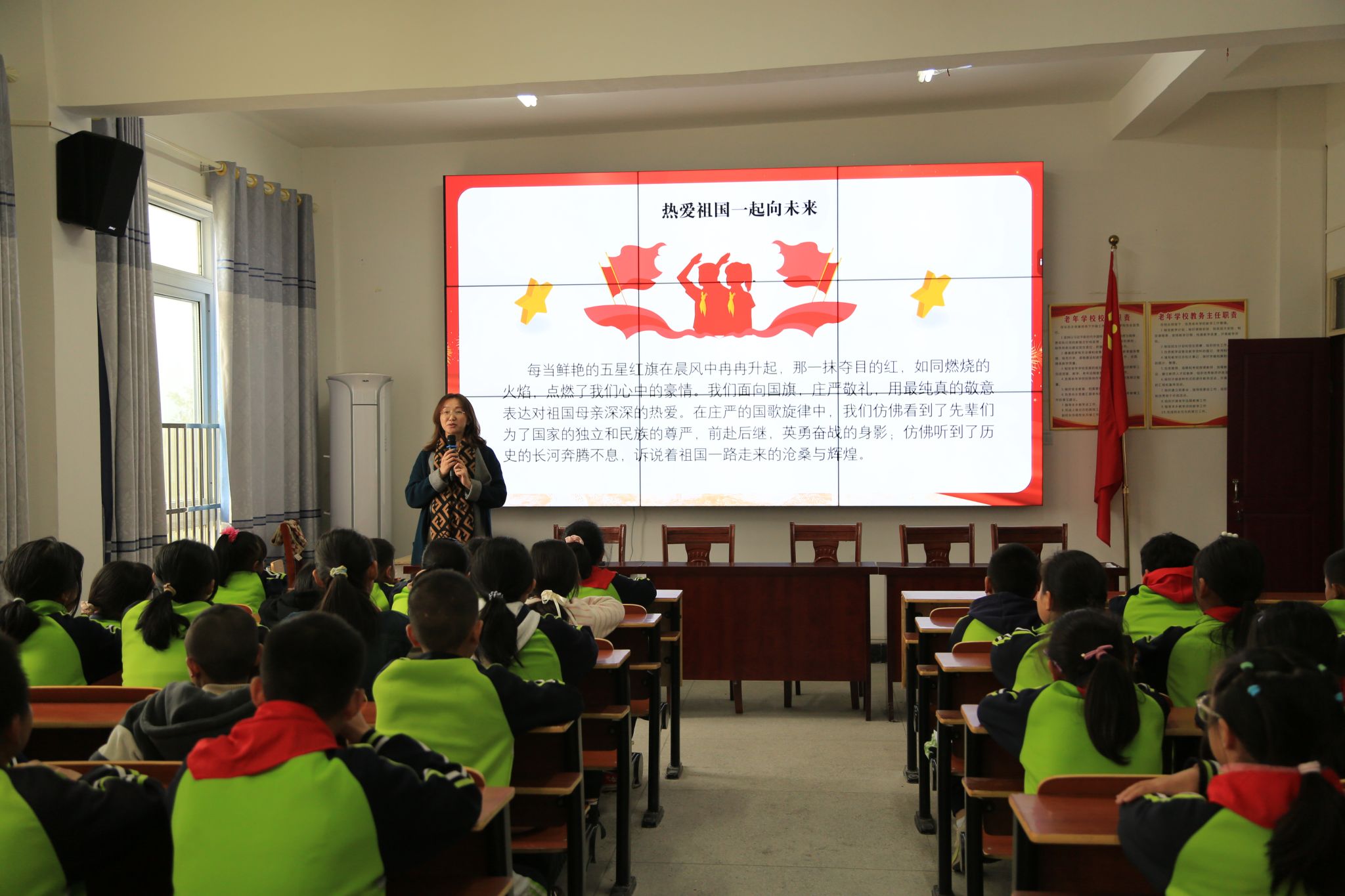 在树林小学,旅游健康学院团总支书记殷宏伟以祖国美好山河、优秀传统文化和红色革命故事为切入点,用生动的语言和丰富的历史资料,让学生们对祖国的壮丽风貌和悠久历史有了更深刻的认识。课堂上,学生们认真聆听、踊跃分享自己对祖国的感悟,课堂氛围充满温暖与感动。