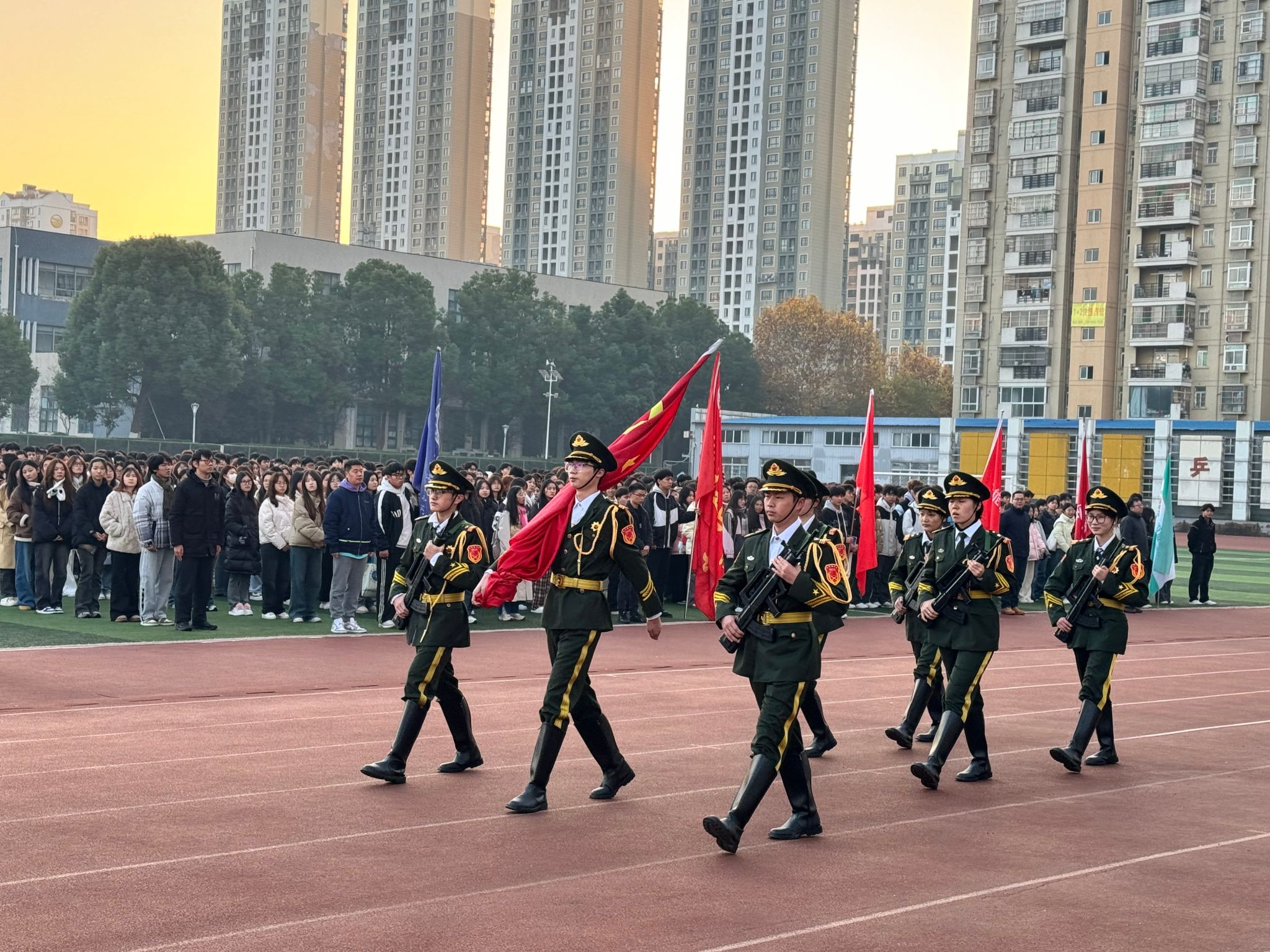 12月2日,活动周的序幕在“国旗下的演讲”爱国主义教育活动中拉开。庄严的升旗仪式后,校法律爱好者协会成员朱晴怡带领师生晨读宪法内容,深入了解宪法的发展历程和地位,特别是党的十八大以来全面依法治国取得的历史性成就等。师生们深刻感受到宪法作为国家根本大法的重要意义,增强了自觉学习法律、维护法律权威的责任感和使命感。活动最后,千余名师生齐声合唱《宪法伴我们成长》。嘹亮的歌声回荡在田径场上,表达了青年学子对宪法精神的认同与践行意愿,也展现了新时代青年爱国爱法的昂扬风貌。