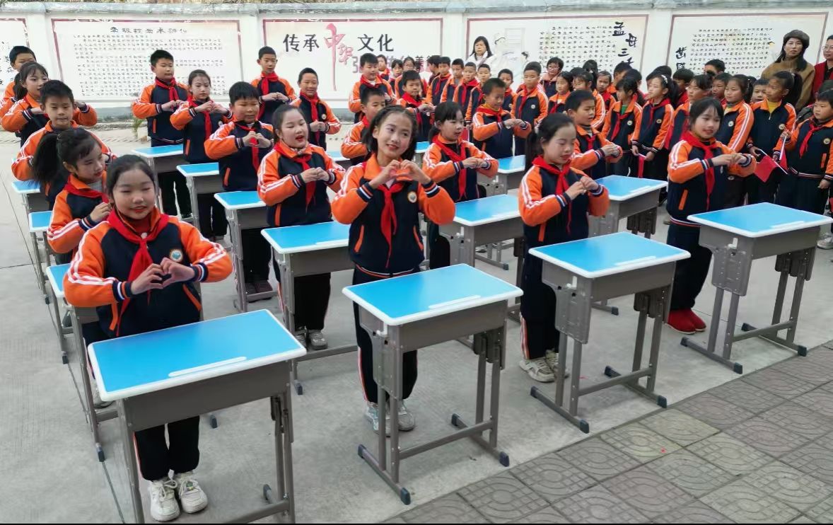 捐赠仪式上,爱心人士深情分享了自己捐赠的初衷和对乡村教育的深厚情怀,赢得了现场所有人的热烈掌声。树林小学校长卓路燕对我校团委及爱心人士的慷慨援助表示衷心的感谢。她指出,这批新课桌椅不仅极大地改善了同学们的学习环境,更体现了社会各界对教育事业的深切关怀和支持。学生代表则用稚嫩而坚定的声音表达了他们好好学习、回报社会的坚定决心。随后,学生们通过精心准备的手势舞《谢谢你》和以新课桌为道具的课桌舞《爱我中华》,展现了他们最纯真的感激之情和积极向上的精神风貌。