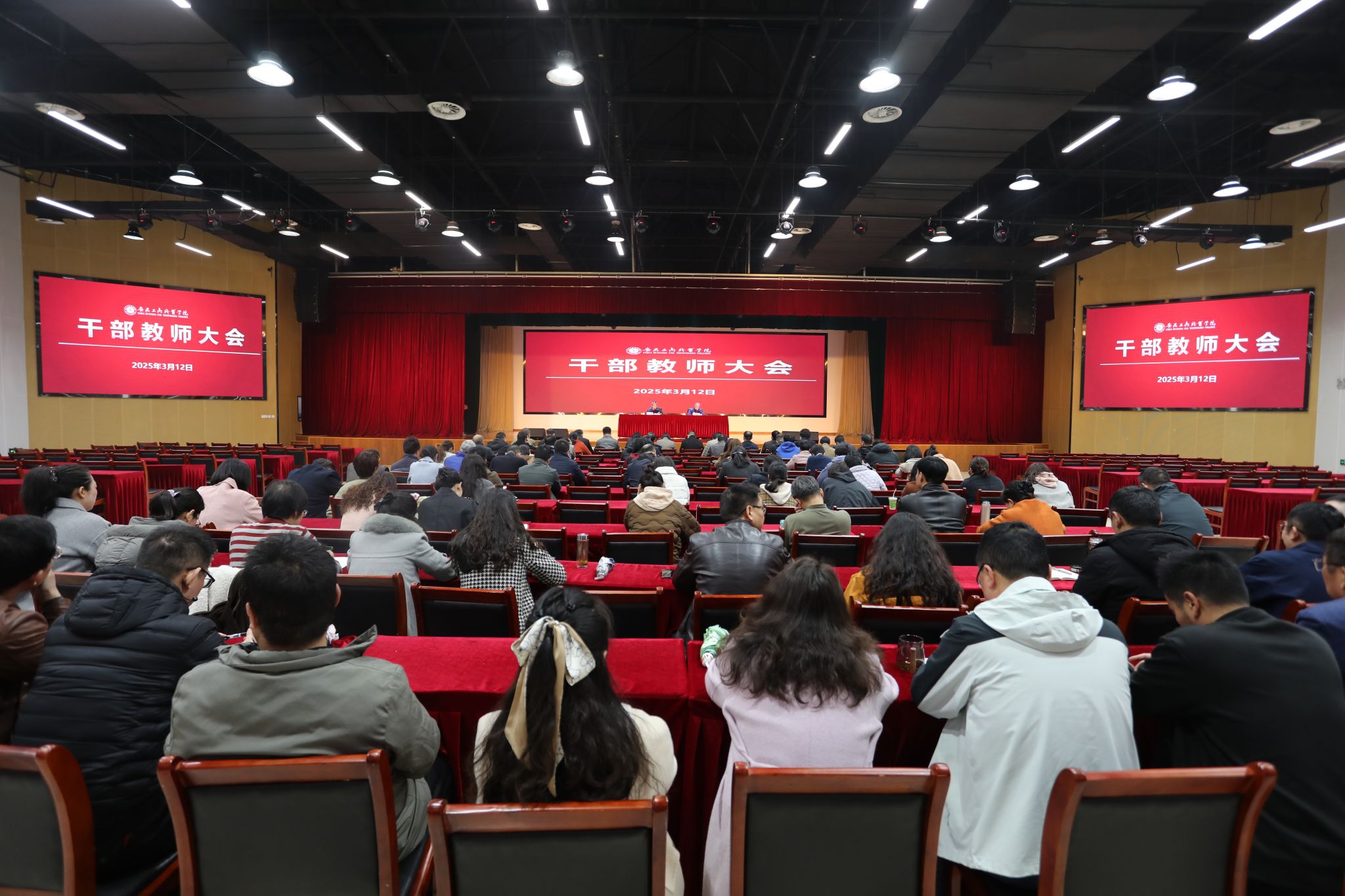 学校在大学生活动中心召开了干部教师大会,考核组全体成员出席会议,学校领导班子成员、行政处室负责人、二级学院党政正职(含主持工作副职)、副高以上职称人员及学生代表等参加会议。会议由校党委书记齐建平主持。