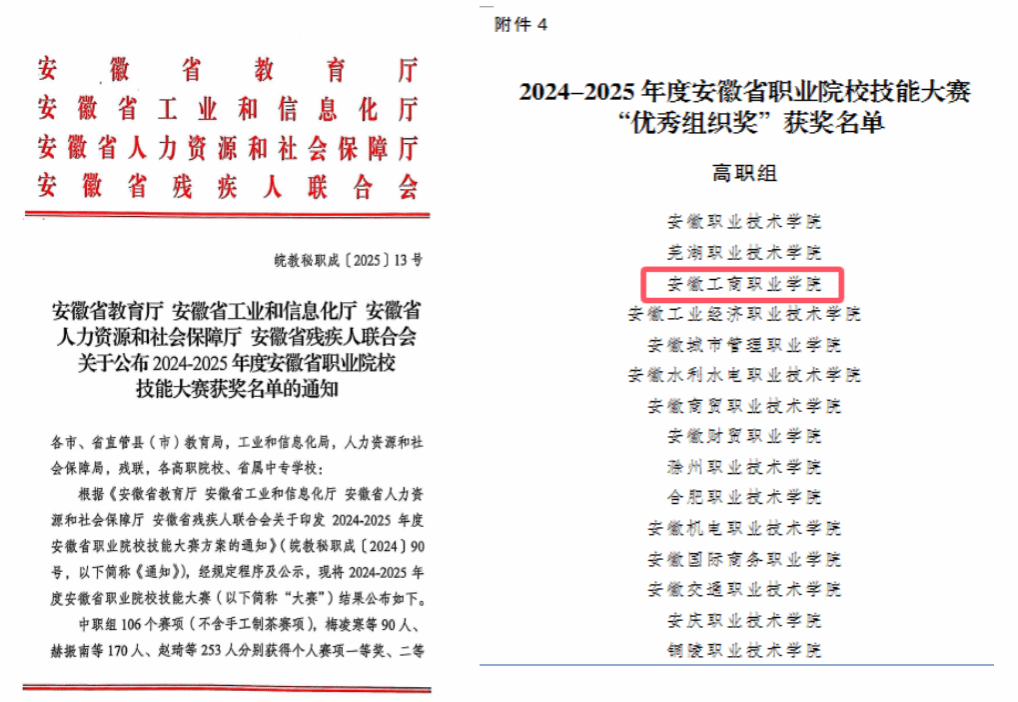近日,由安徽省教育厅、安徽省工业和信息化厅、安徽省人力资源和社会保障厅、安徽省残疾人联合会等四部门联合发布的《2024-2025年度安徽省职业院校技能大赛获奖名单》揭晓,我校师生团队在本次大赛中表现突出,共斩获113项团体赛大奖,并荣膺高职组“优秀组织奖”殊荣。