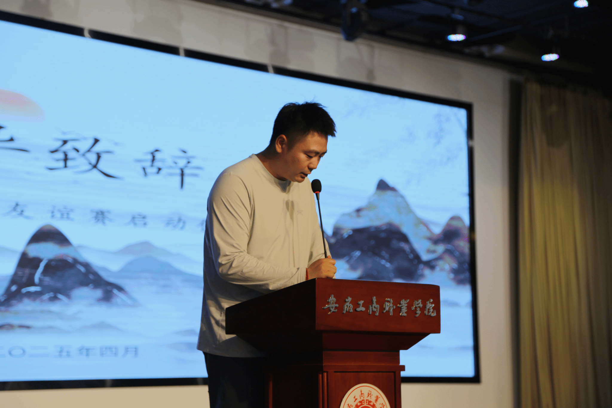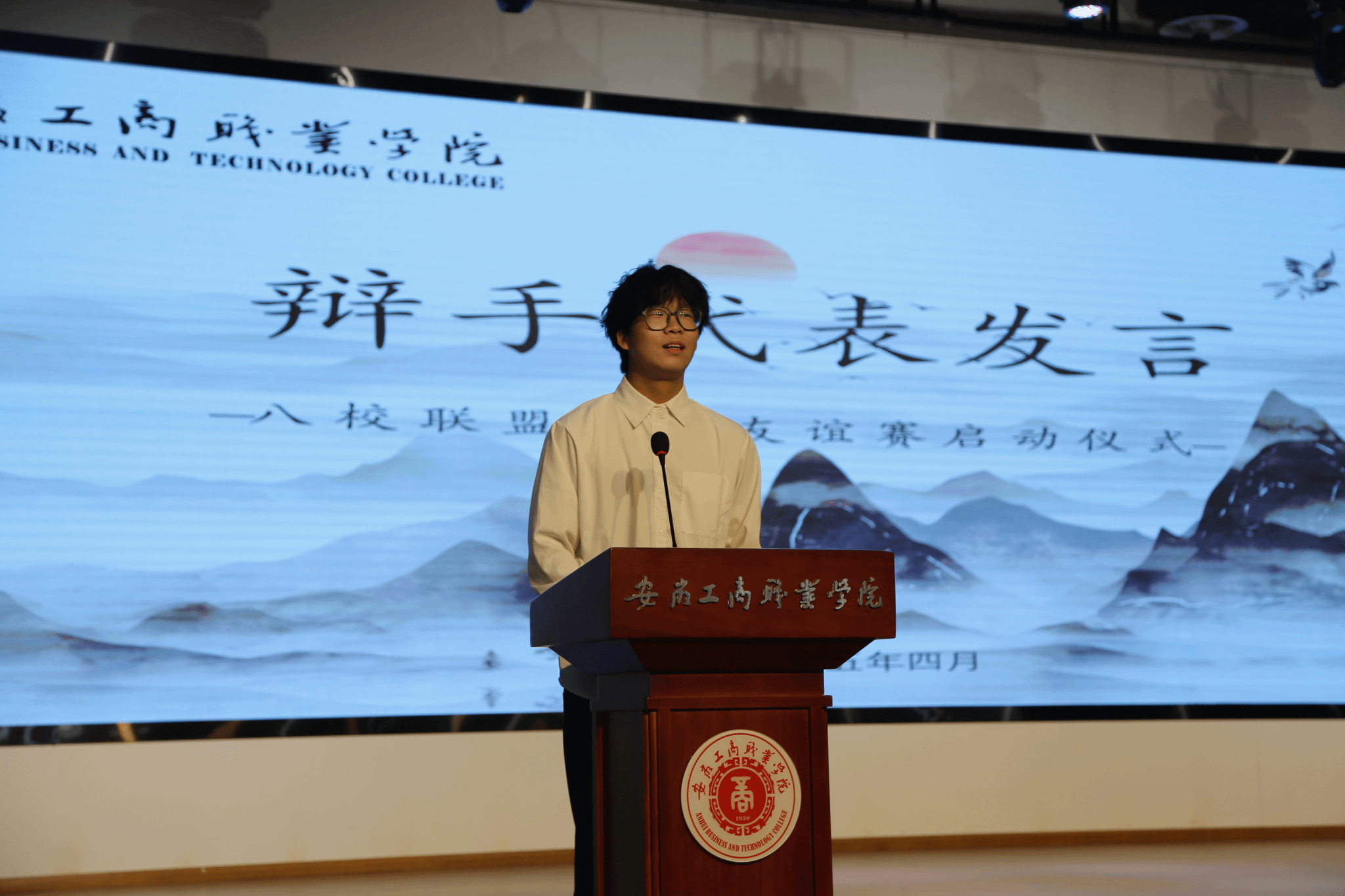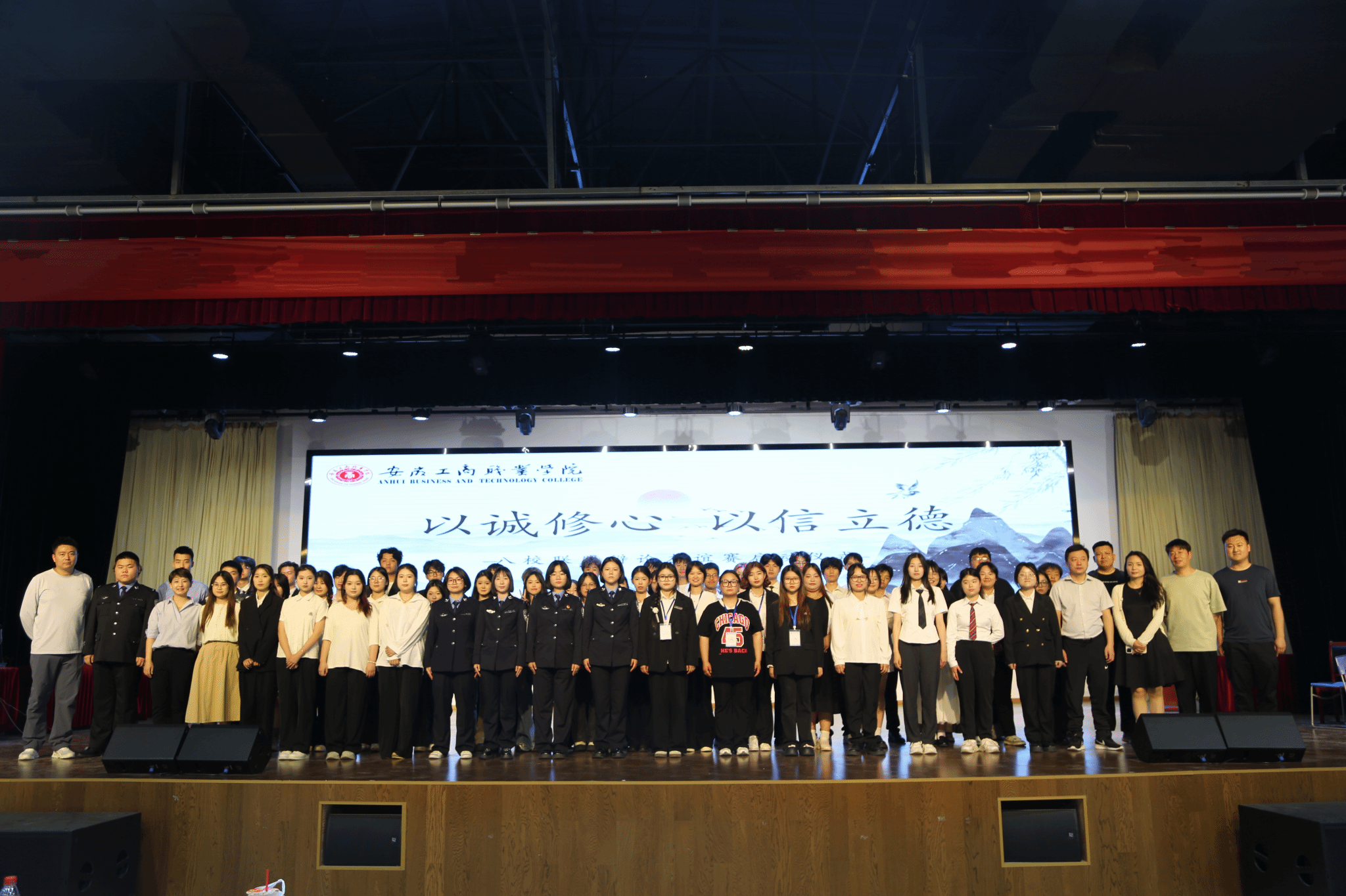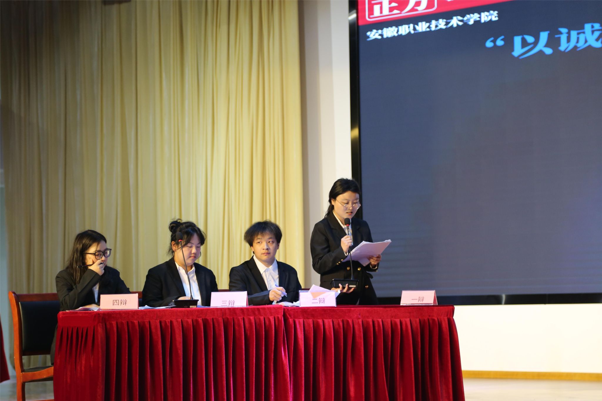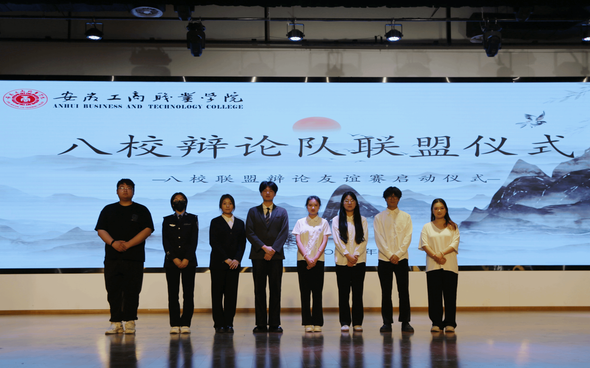 八校联盟启动仪式:活力与仪式感交织。上午10时,活动在热烈的氛围中拉开帷幕。校健美操协会以一曲扇子舞《寄明月》点燃全场,传统韵味与现代活力完美融合,赢得阵阵掌声。随后,现场播放的短片《八校同心·辩途同行》生动呈现了各参赛队伍备赛历程与团队风采,传递出“以辩会友”的温暖力量。童乐致辞表示:“诚信是立身之本,辩论是求真之途。希望青年学子在观点交锋中锤炼思辨能力,在思想碰撞中筑牢诚信之基。”安徽审计职业学院辩论队领队张天露作辩友代表发言,他强调“胜负之外,更珍视跨校交流的收获与情谊”。随着八校代表共同上台合影留念,标志着校际辩论合作网络正式建立。