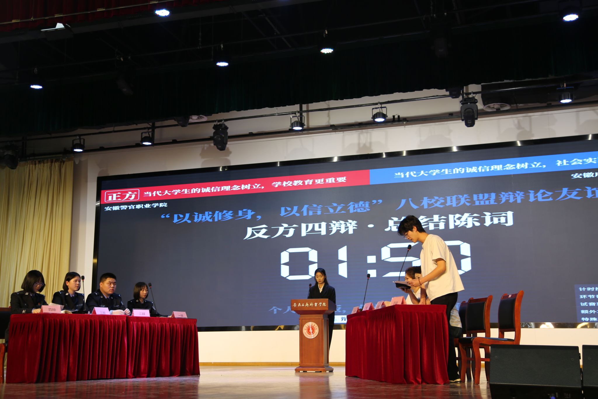 思辨交锋:唇枪舌剑话诚信。上午的八校联盟启动仪式结束后,安徽职业技术学院辩论队、安徽警官职业学院辩论队、安徽财贸职业学院辩论队、安徽城市管理职业学院辩论队、安徽审计职业学院辩论队、合肥幼儿师范高等专科学校辩论队、安徽广播影视职业技术学院辩论队以及安徽工商职业学院辩论队齐聚一堂,以语言为刃、以逻辑为盾,共话诚信之道,共绘青春友谊。活动全程贯穿“友谊第一,比赛第二”的理念,围绕诚信教育主题设置多元辩题,涵盖“诚信教育更需要道德层面的约束/法律层面的保障”、“教育评价体系应该更加重视学生的诚信记录/学术成绩”、“deepseek等语言类模型的爆火,随之出现AI造假论文等现象。由此可见,人工智能的迅猛发展对信用体系建设利大于弊/弊大于利”、“当代大学生的诚信理念树立,学校教育/社会实践更重要”等四组现实议题。全天八支队伍分四组展开对决,辩手们引经据典、妙语连珠,既有对社会热点的犀利剖析,也不乏对传统文化价值的深刻诠释。“这不仅是一场辩论赛,更是一次价值观的共鸣之旅。”校辩论协会会长周楷翔感慨道,“我们在交锋中看见差异,也在共识中收获成长。”