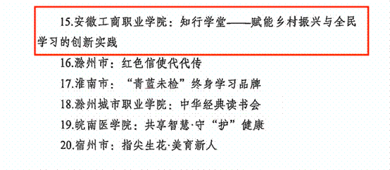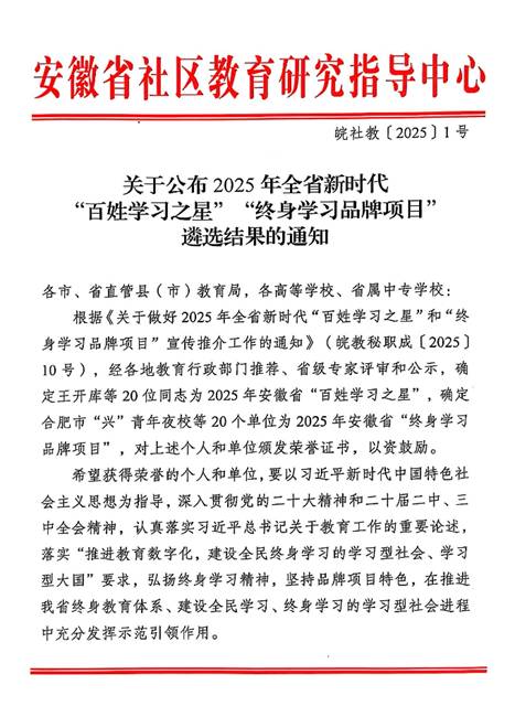 近日,安徽省社区教育研究指导中心公布2025年全省新时代“百姓学习之星”“终身学习品牌项目”遴选结果。我校申报的“知行学堂——赋能乡村振兴与全民学习的创新实践”项目获评2025年安徽省“终身学习品牌项目”。