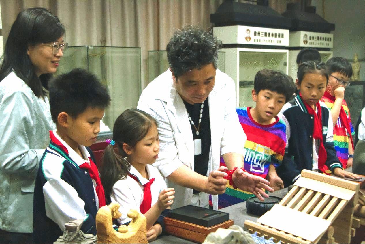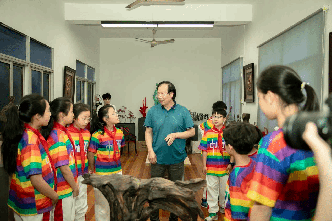 开幕式上孔成致欢迎辞。简要介绍了学校办学情况,重点分享了学校“劳动+艺术+思政”融合育人模式,强调劳动教育是培养德智体美劳全面发展人才的重要抓手,并鼓励学生在实践中感悟工匠精神。随后,艺术设计学院副教授、省级花艺教练韦鸾鸾现场讲授“徽派”插花技法,指导大中小学生们以小组协作形式完成花艺作品。活动还组织师生参观国家级大师工作室,中国雕刻工艺大师(徽州三雕)查嵘、省级工艺美术大师(陶艺)马业长给学生们做了作品介绍,让学生近距离感受传统工艺的精髓。